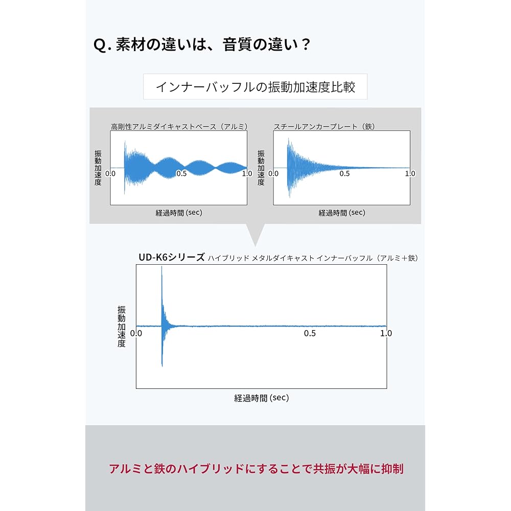 The 6 Series is a professional package that brings out the full potential of his speakers, allowing for dramatic improvements in sound quality through innovative ideas and technology.Anyone can easily install the 6 Series. Maximize speaker performance and dramatically improve sound quality with just two items. The professional package of high-quality inner baffles includes a "hybrid metal die-cast inner baffle" and a "wave-shaped sound insulation cushion" to improve sound quality. This is a package that allows you to easily achieve this. With just two items, you can increase the strength of the door iron plate, suppress resonance near the mounting area, and reduce interference from out-of-phase sound from the back of the speaker. The sound is clearer and has more volume, dramatically improving the sound quality inside the car. Adopts innovative technologies such as ``hybrid metal die-casting'' and ``wave-shaped sound insulation cushion'' that maximize the speaker's original performance through innovative technology and ideas. It maximizes the original performance of the speaker and easily and reliably improves the sound quality.・The reason why it is not only strong and heavy. "Hybrid metal die-cast inner baffle" that thoroughly suppresses unnecessary resonance Generally, it is said that the ideal material for the baffle plate that supports the speaker unit is strong (high rigidity) and heavy (high specific gravity). We focused on the fact that natural vibrations can be suppressed to a surprising extent when different types of metals are closely bonded to each other, and by combining aluminum, iron, and brass, we created a "hybrid metal die-casting" with high rigidity and high specific gravity that suppresses the resonance inherent in metals. Developed "Inner Baffle". By increasing the strength of the installation location while suppressing unnecessary vibrations in the speaker unit, low-frequency response is dramatically improved and tighter low-frequency reproduction is achieved. Matte black vibration damping paint is applied to the "highly rigid aluminum die-cast base" to further improve the damping effect, creating a texture unique to the top-of-the-line model. The ``Steel Anchor Plate'' has been subjected to a finer-grain blasting process than conventional ones, creating a larger contact area with the speaker frame and inner baffle base, contributing to improved rigidity. In addition, a high-density, low-repulsion, high-performance sealing material is used on the bottom. Improves adhesion to the door iron plate and eliminates distortion and resonance. *UD-K625/K629 does not use brass, but is a combination of aluminum and iron. By using damping paint, the sound pressure level has been reduced by 43.9% and the resonance time has been reduced by up to 34.2% (compared to conventional models). Significantly suppresses unnecessary resonance sounds and dramatically improves sound quality.・About the wave-shaped sound insulation cushion We use a ``wave-shaped sound insulation cushion'' that has excellent sound insulation and vibration absorption properties, efficiently disperses reflected sound waves generated within the sound insulation cushion cylinder, and obtains flat frequency characteristics. By shielding out-of-phase sound from the back of the speaker, which leaks into the door trim and goes around through service holes, it greatly improves the disturbance in frequency characteristics. Furthermore, the different wave shapes on the outside and inside of the sound insulation cushion achieve effective sound insulation and vibration absorption, and by efficiently dispersing the reflected sound waves that occur inside the sound insulation cushion cylinder and reducing loss in the mid-low range, Achieves clear music playback with a focus on the mid-low range. Easy for anyone to install, only requires 2 parts High-quality inner baffle Professional package only has 7 parts: ``hybrid metal die-cast inner baffle'' and ``wave-shaped sound insulation cushion.'' Anyone can easily install it, and it can dramatically improve the acoustic environment inside the vehicle. High-quality design with functionality unique to top-of-the-line models A high-rigidity die-cast aluminum base spray-painted with matte black vibration-damping paint and an elegant copper-colored steel anchor plate combine to deliver both design and functionality. Achieving both at a high level. It is simple yet produces a high quality feel and rigidity.