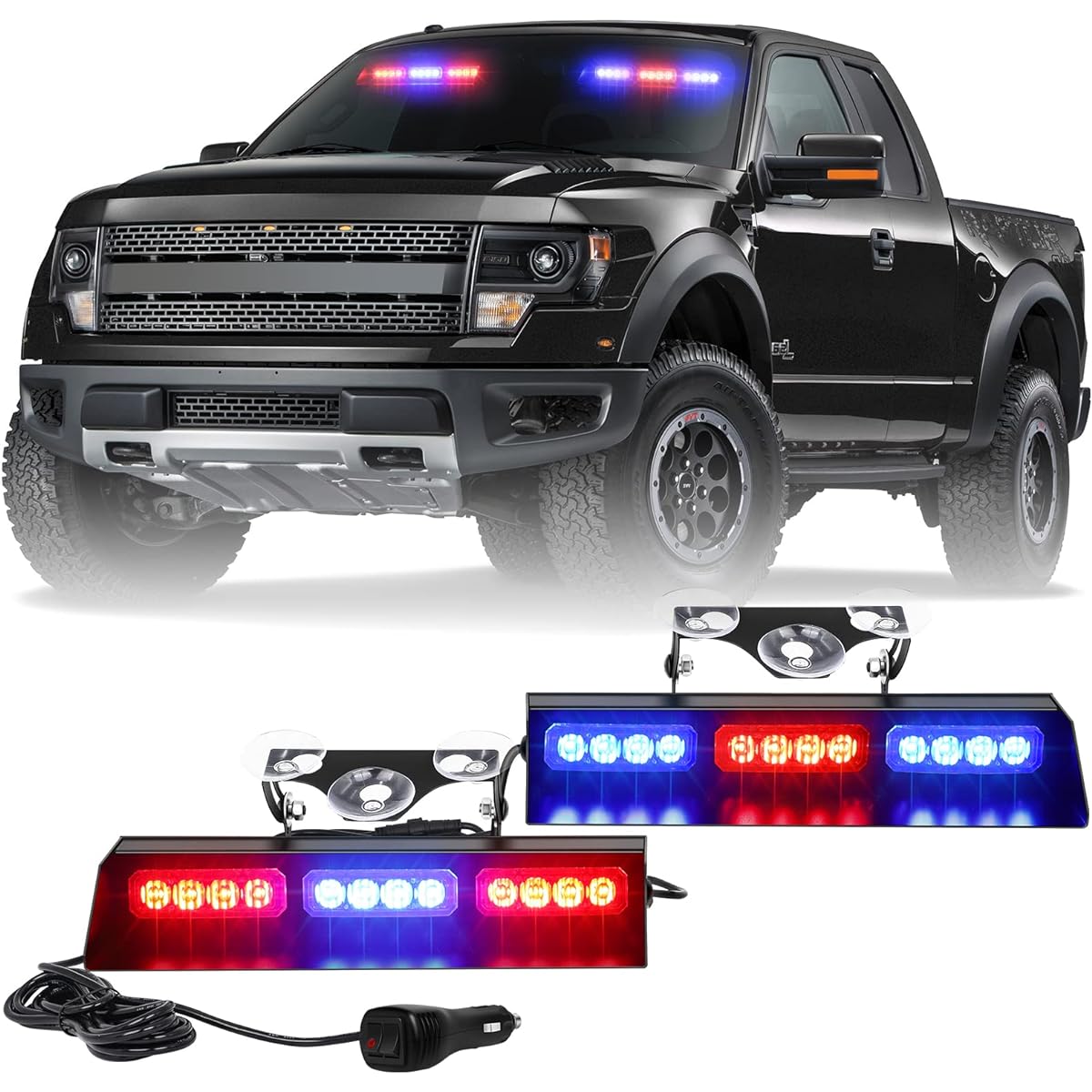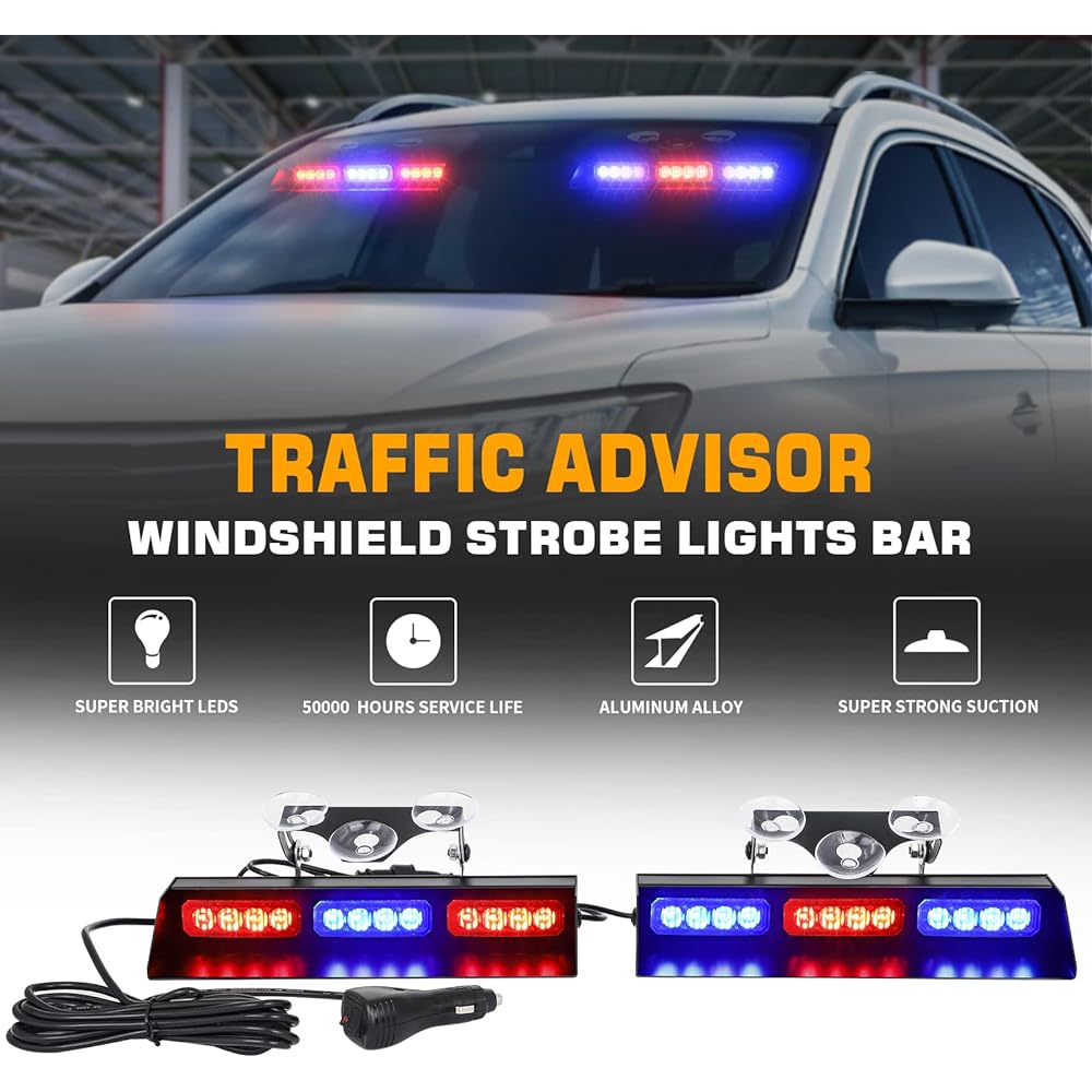High quality windshield light: Comes with 24 high brightness lamp beads. High quality aluminum alloy & durable polycarbonate lens. You'll be clearly visible during the day, making other drivers aware of your presence and keeping you safe. Improve driving safety and prevent traffic accidents. Service life is 50,000 hours. Easy to install: Adjustable suction cup holder bracket. No drilling or damage to the vehicle is required. Can be applied to windshield or rear window. Split design allows you to install more freely. 16 flash modes: 16 flash patterns and final memory recall. You can easily switch between strobe modes by simply pressing the double switch button. Plug and play, meet your needs in different situations. The flash patterns of the two lights are synchronized. Flashback Guard: This specially designed guard securely fixed to the windshield prevents glare from flashbacks from LEDs. High-brightness aluminum alloy housing and angle-adjustable design prevent the driver's view from being obstructed. Product size: 10.1"L x 3.1"W x 1.57"H The wire length from light to light is 3.2 feet. The wire length from the light to the cigarette lighter is 9.8 feet.