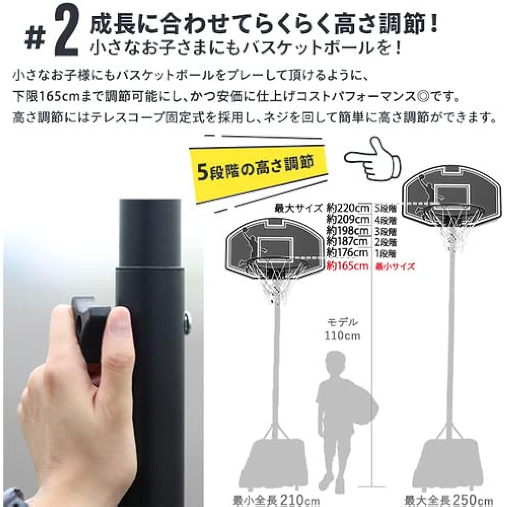 [Product Specifications] ● Target age: 4 years old and above ● Backboard size: Approximately 71 x 45 cm Made of HDPP (Reinforced polyethylene color board) ● Rim size: Diameter 38 cm (Smaller than the official basketball goal diameter, but compatible with size 5, 6, and 7 balls) ● Base: Made of HDPE (reinforced polyethylene) ● Base tank size: Approximately 76 x 45 x 13 cm ● Pole: Steel with pad ● Height adjustment: Goal ring height approximately 165 cm to 220 cm ● Height including board: Approximately 210 cm to 250 cm *Cannot be used or stored in places with ceiling heights below the above size. Please be sure to check in advance. ● Weight: Approximately 8.5 kg (base tank empty) ● Tools required for assembly: 10 mm/13 mm/14 mm compatible wrench Phillips screwdriver Sand and sand funnel, or water and hose Recommended for 2 adults or more * Includes Japanese assembly instructions. *Tools are not included with the product. ●Package size: Approx. 78 x 58 x 20 cm [Product details] The height can be adjusted to a low position so that it can be used mainly by children. This is a basketball goal for kids with a red back board. [Product features] - A mini basketball goal with pole protection pads, making it a safe gift. - A popular reinforced plastic design board model. - Simple structure makes it easy to assemble. - 38 cm diameter rim (inner diameter) for children. - Togoal net (with one spare). - Comes with rollers for moving. ,.