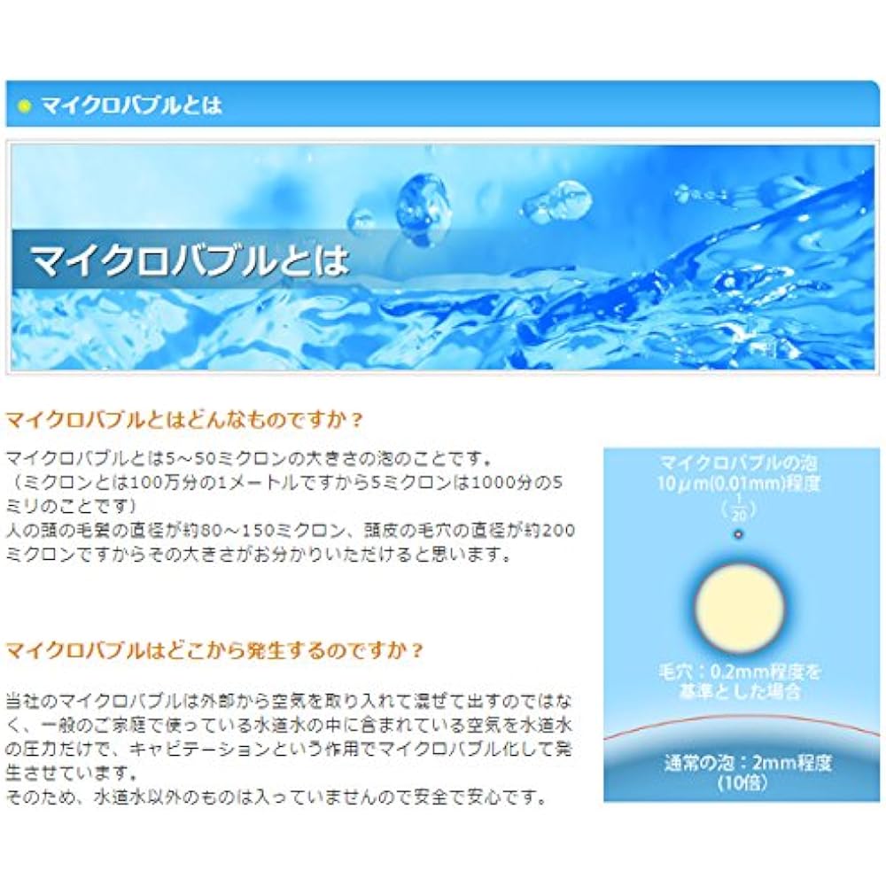 ●A micro/nano bubble shower can be used just by replacing the shower head.●The world's first mechanism that generates microbubbles through cavitation at the tip of the showerhead.●Micro bubbles wash away dirt clogged in pores.●The diameter of the connection screw is ISO-planned G1/2 ●KVK adapter included ●Basic effects: Cleans dirt clogged in pores, prevents slime inside the drain plate and drain pipe, prevents detergent from remaining after rinsing, prevents hot water from cooling down. , water saving ● Installable shower heads: TOTO, INA (LIXIL), Kakudai, Sanei, Mizusei Seisakusho (Hayakawa Valve), Mizutani Valve, Takagi, Grohe, Hansgrohe, Mohn, *KVK can be installed with the included adapter ●Note 1) Cannot be installed on the shower head attached to the balance pot installed next to the bathtub with Tokyo Gas, Osaka Gas, Rinnai, Noritz, Gaster, INAX gas water heaters, Note 2) Shower Cannot be installed on types where the shower head and shower hose are integrated and cannot be removed