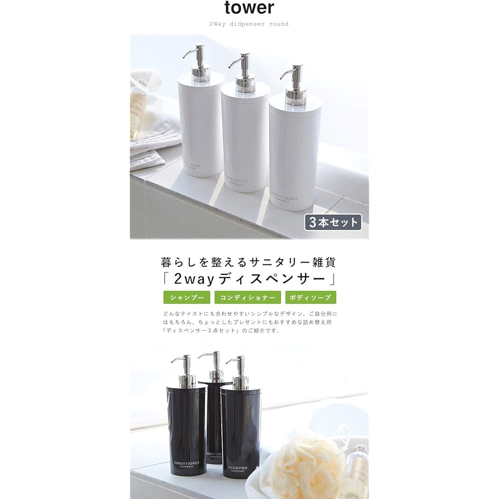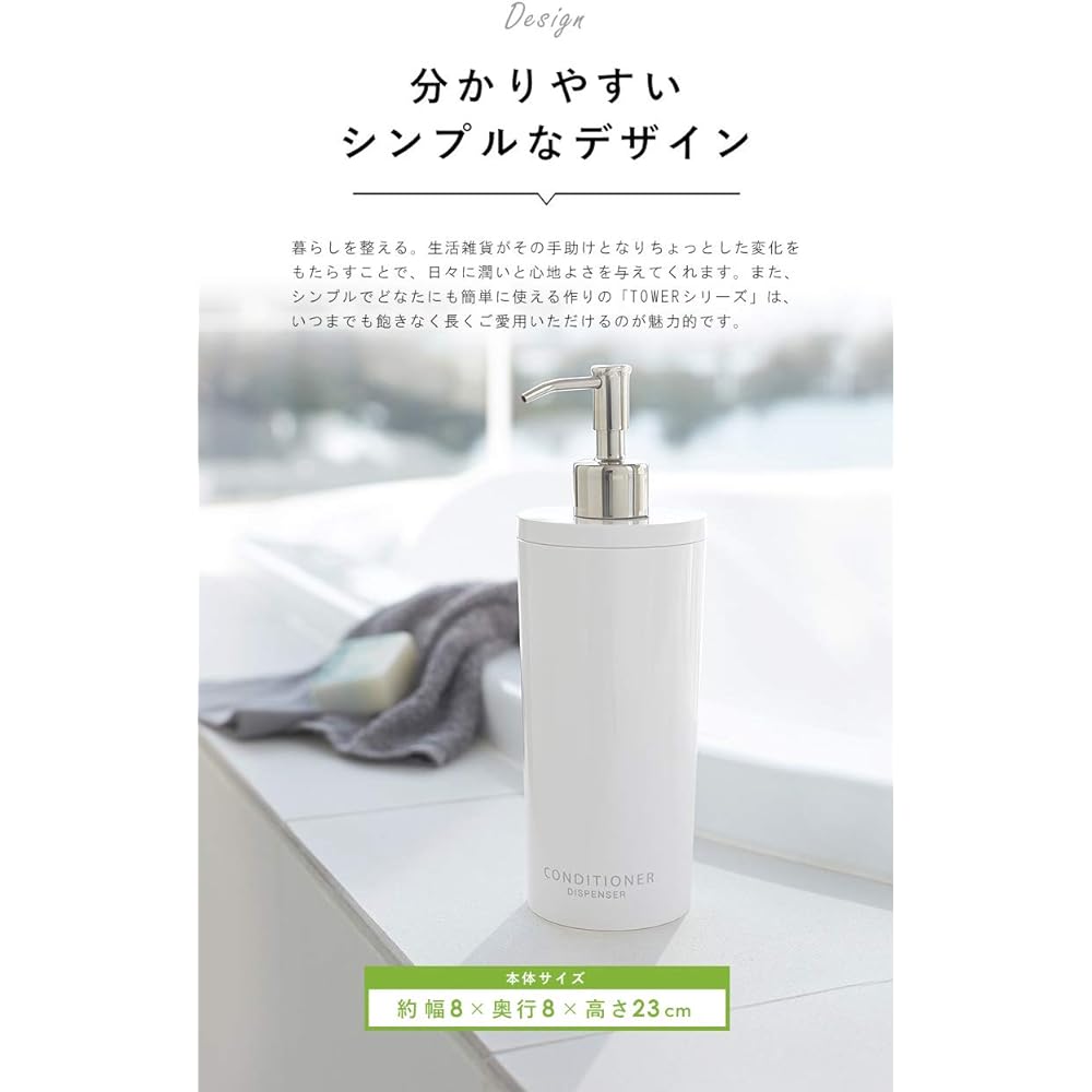 A stylish and stylish refill bottle that keeps your bathroom looking beautiful and clean at all times. Not only does it look neat and tidy, but it also reduces container waste and offers an eco-friendly lifestyle. The ``TOWER series'' is simple and easy to use for anyone, and it is attractive that you can use it for a long time without getting tired of it. -Size- Body size: Width 8cm x Depth 8cm x Height 23cm -Materials- Body: ABS resin Pump: Stainless steel Pipe: Polyethylene -Specifications- Color: Black Heat resistant temperature: approx. 80℃ Cold resistant temperature: approx. -40℃ Container capacity: 500ml Compatible size: Refill packs up to 400ml