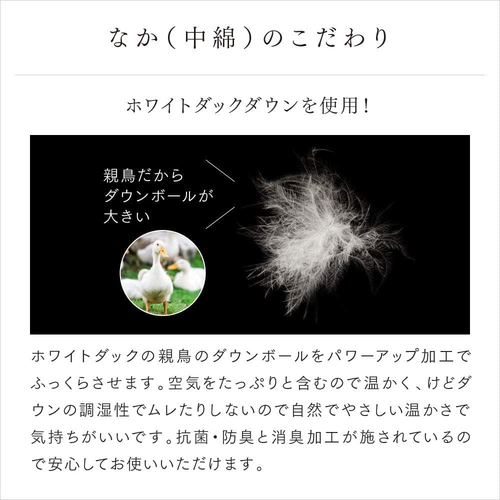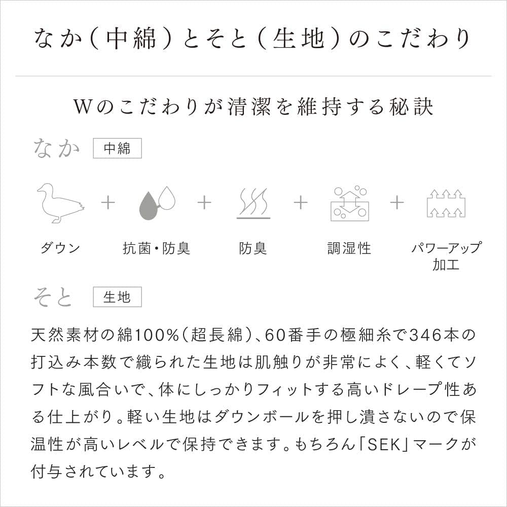 HIYORI duvet is an Excel Gold Label product that is certified by the Japan Feather Products Cooperative Association and is a "proof of peace of mind for down comforters." This is the highest quality duvet that has passed quality standards (mixture ratio, bulkiness, cleanliness, etc.). [Material: Filling] 90% down, 1.2 kg, down power 350 dp, and the down ball of the white duck's parent bird has been processed to power up and become plump! It contains plenty of air, so it provides natural and gentle warmth. [Material: Side fabric] 100% cotton (extra long staple), woven with 346 threads of 60 count ultra-fine thread, is light to the touch, and has a high drape finish that fits securely. This light fabric is key because it doesn't crush the down ball, so it has high heat retention and is very warm! [Function] Antibacterial, deodorizing, pollen adhesion prevention, humidity control function (natural warmth that prevents stuffiness) [Manufacturing] Made in Japan. Each piece is carefully tailored at a partner factory in Miyazaki Prefecture.