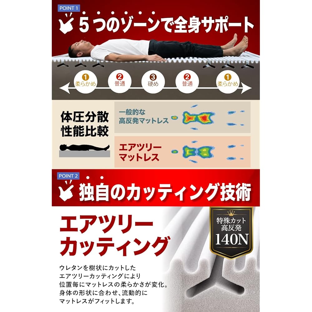 [The ideal sleeping position is standing] The Air Tree mattress is characterized by its high resilience yet the comfort of sleeping as if you were wrapped in it. The reason for this is that the firmness of the urethane in this mattress is adjusted to fit the body in five locations from the head to the feet, making it possible to achieve the ``standing position,'' which is said to be the ideal sleeping position. The wave-shaped cut processing on the surface of the mattress allows for both "high resilience stability" and "low resilience fit". [Body pressure distribution! Supports the whole body in 5 zones】In addition, the Air Tree mattress has high resilience and is good at dispersing body pressure, and has the effect of improving sleep, which is an important element related to comfort and health. It has high pressure dispersion properties and reduces the number of times you toss and turn, allowing you to sleep deeply and improve the quality of your sleep. This mattress helps reduce your body fatigue when you wake up, making it the perfect mattress for a comfortable start to the day. [Highly breathable and comfortable to sleep on] The Airtree high resilience mattress uses open cell foam that allows fresh air to be taken in when turning over. In addition, the waveform and air-through structure create a gap between the mattress and your body that allows air to pass through, allowing you to sleep comfortably and with minimal heat. In addition, the cover is removable and washable, so it can be used hygienically. [High durability that will not wear out even after 8 years of use] The Air Tree high resilience mattress has demonstrated a recovery rate of 97.9% in the 80,000-press durability test of the Japanese national JIS standard. Due to its excellent durability, this high-resilience mattress will not buckle even after many years of use. *This is a theoretical value, and the durability will vary depending on the usage environment and usage conditions. [Product details] Air tree mattress / Structure: Characteristic cutting wave pattern / Material: [Body] Highly resilient urethane foam [Inner bag] 100% polyester [Cover] 100% polyester / [Size] Single (approx.) Width 97cm x Depth 195cm × Height 8cm / Weight: Approx. 5.7kg / Hardness: 140N / Product details: Fixed band included / Compressed roll packaging / Planned in Japan / Clears safety standards of OEKO-TEX STANDARD 100, CertiPUR-US, CertiPUR / 1 year quality guarantee / Inquiries: Japan Domestic Counter