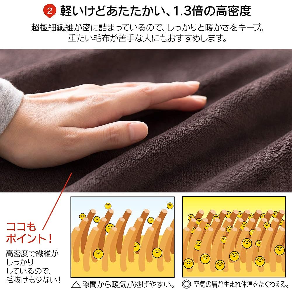 A premium microfiber series that is thin, light, and extremely warm. It has a smooth texture and is densely packed with ultra-fine fibers to keep you warm. Recommended for people who don't like heavy blankets. Anti-static treatment reduces unpleasant crackling. The blanket has a high density and does not shed easily, so you can wash it at home.