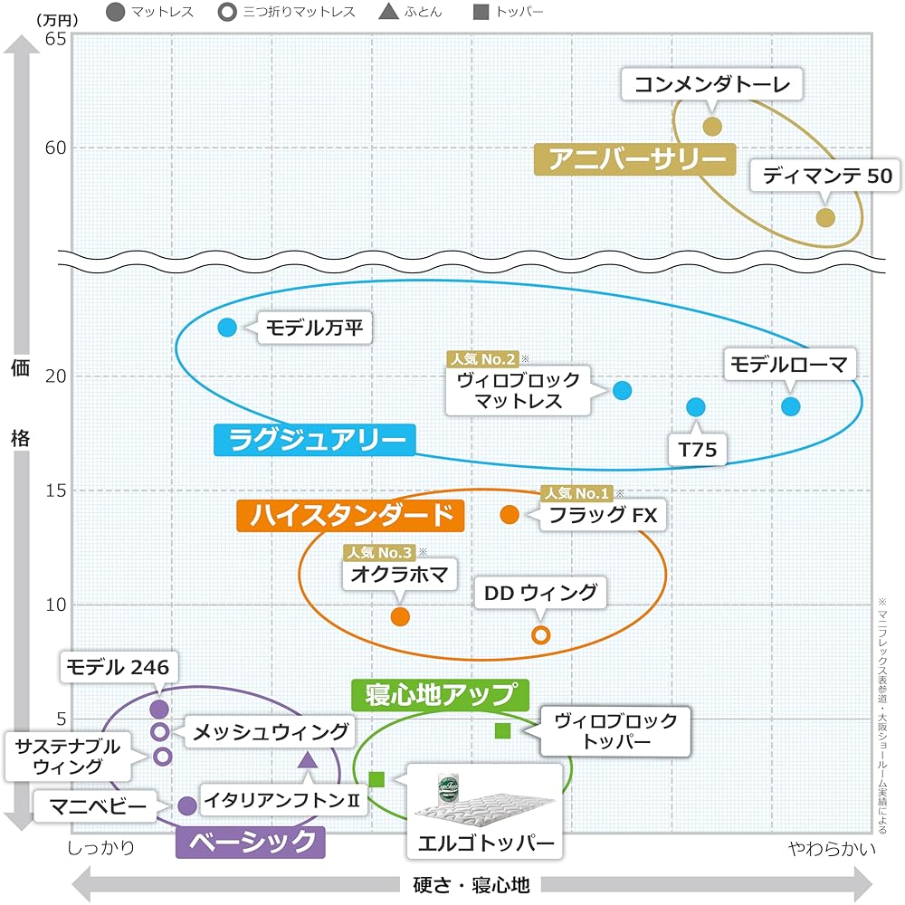 Maniflex's overlay product provides elasticity and resilience and evenly distributes body pressure by simply layering it on your current bed, mattress, or futon. If you use it in conjunction with Maniflex products, you can upgrade to a luxurious specification that combines ``excellent body pressure distribution'' and fluffy ``comfortable sleep''. The surface fits comfortably to the body thanks to the action of. It is characterized by a fluffy feel due to the action of and on the back side. Reversible design allows you to enjoy different sleeping comforts on the front and back sides. [About size] Due to the quilting process, the Ergo Topper has an uneven and fluffy finish, so it will be slightly shorter than the listed size. Brand introduction "Maniflex" was born in Florence, Italy in 1962, and has a 60-year history of being used by more than 35 million people in 99 countries around the world, thanks to its world-patented vacuum roll pack technology. It is one of the world's largest comprehensive bedding brands, with high-resilience mattresses as its representative. Due to its superior sleeping comfort, Maniflex mattresses have been used at the Miyanoshita Fujiya Hotel, one of Japan's most representative classic hotels, which is known to have been loved by world-famous people such as Emperor Showa, Helen Keller, John Lennon, and Yukio Mishima. It is used in over 500 top-class hotels around the world, including 5-star hotels, including Okura Tokyo (formerly Hotel Okura Tokyo).