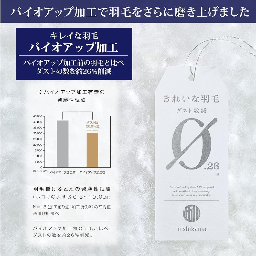 Nishikawa down comforter. ◆A domestic duvet made from 85% high quality gray duck down. Made with a generous 1.3kg of feathers, it is soft and warm. ◆The secret to the warmth of a duvet is that each piece of down inside contains plenty of air and acts like an insulator. In addition, down has high moisture absorption and desorption properties, so the inside of your futon won't get stuffy and will keep you comfortable. ◆Unique bio-up processing is applied. The sorted feathers are ``humidified and dried'' to restore their fullness, and ``cooling dust removal'' removes impurities from the down, resulting in warmer, lighter, and cleaner feathers. This is a clean feather with approximately 26% less dust than the unprocessed feather (according to Nishikawa Co., Ltd., dust generation test). ◆In order to reduce the unevenness of the feathers, we have adopted a fine-fit quilt with narrower quilt width at the collar and feet. It's fluffy and warm and fits over your shoulders to prevent you from getting cold. ◆The side fabric has been treated with silver nanotech antibacterial treatment. ◆There are 8 loops for the duvet cover, so you don't have to worry about the duvet shifting. ◆Made in Japan◆The feathers are animal fibers, so even though they are thoroughly washed, they may have a smell when you first use them. The odor will fade as you use it, but if you are concerned about it, you can reduce the odor by pressing the futon tightly to let the air out and replacing it with fresh air. ◆Size: 150X210cm◆Side fabric: 85% polyester, 15% cotton (AG fresh antibacterial treatment) Filling: 85% gray duck down, 15% feather 1.3kg Down power 350◆Country of origin: Japan