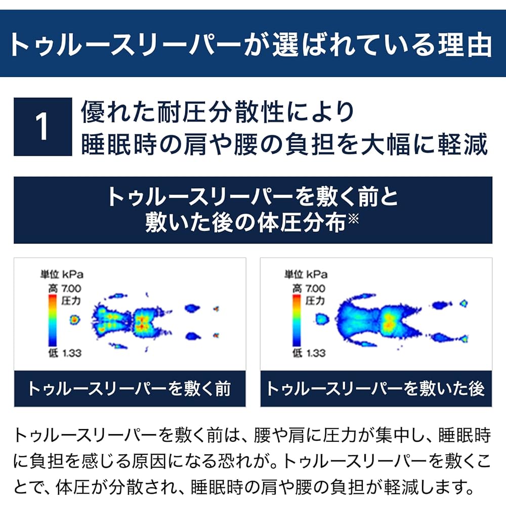 A set of two popular products from Shop Japan! It's even more affordable with a cover included! While maintaining the comfort and antibacterial and mildew treatment of the previous True Sleeper Premier Care, it has been renewed to be dust mite resistant. Now you can sleep more hygienically and comfortably. It disperses the body pressure on your shoulders and hips and gently cradles your entire body.The True Sleeper also supports a comfortable sleeping position and supports your sleep. Also, there is no need to buy new bedding, so it is economical! Just place it on your current futon or bed.