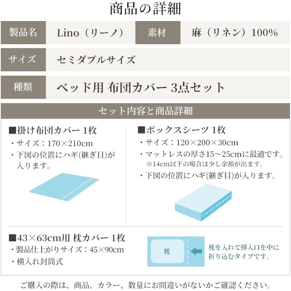 [Product name] Lino [Duvet cover] Semi-double size 170 x 210 cm, with 8 snap buttons [Fitted sheet] Semi-double size 120 x 200 x 30 cm, spun elastic all around *Hugi (fabric seams) are included. Compatible with mattresses up to 25 cm in height [Pillow cover] 43 x 63 cm (for pillows) *Finished size 45 x 90 cm Side insert envelope type [Material] 100% linen [Country of production] Japan (Produced at our own factory attached to the company) )
