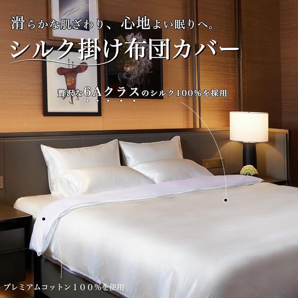 [Silk Duvet Cover/Luxury Sleep] Sleep accounts for one-third of your life and is essential for living a healthy and fulfilling life. Utukky duvet covers are made of luxurious 6A class 100% silk on one side and silky smooth 100% cotton on the other side. This duvet cover made from natural materials is gentle on your skin and allows you to sleep stress-free. Relax from the day's fatigue with a luxurious night's sleep wrapped in high-quality sheets. [A must-see for those who suffer from skin and hair problems! ] Utukky's silk duvet cover is recommended for those who suffer from damage to their hair and skin due to friction. Silk fibers contain sericin, a natural moisturizing ingredient that protects your skin and hair from dryness and friction caused by tossing and turning. It also reduces unruly hair in the morning. Silk duvet covers not only minimize damage to your skin and hair and have beauty effects, but also support a comfortable night's sleep. Get your new "beauty sleep" now! [Perfect for those with atopic dermatitis and sensitive skin] If you sleep in a futon that is prone to breeding of dust mites and bacteria, you may suffer from problems such as allergies and rough skin. For such people, Utukky's silk duvet cover is recommended. Silk's unique antibacterial properties keep dust mites and bacteria away. Furthermore, silk is less likely to generate static electricity, creating a cleaner sleeping environment. With Utukky's silk duvet cover, even people with atopic or sensitive skin can sleep comfortably. [Silk duvet cover that can be used in all seasons] If you don't want to worry about changing your duvet cover according to the season, we recommend Utukky's silk duvet cover. Silk has a moisturizing effect, but it also has excellent moisture absorption, moisture release, and breathability. Therefore, it is hygienic and does not get stuffy even if you sweat while sleeping. In addition, silk fibers have a porous structure that allows them to contain a lot of air, which protects your hair and scalp from getting cold while you sleep, supporting a comfortable night's sleep all year round. Get a good night's sleep with Utukky's silk duvet cover, which provides a comfortable night's sleep no matter the season! [Easy installation! ] Utukky's futon cover has a button closure, making it very easy to change the futon! There are 8 strings on the inside of the duvet cover, so you don't have to worry about the duvet slipping out of place. In addition, since there are no zippers or metal fittings used, there are no concerns such as hurting your skin, getting the fabric caught in the zipper, or being unable to close it due to breakage. Easy to replace and hygienic silk duvet covers make daily care of your bedding fun!