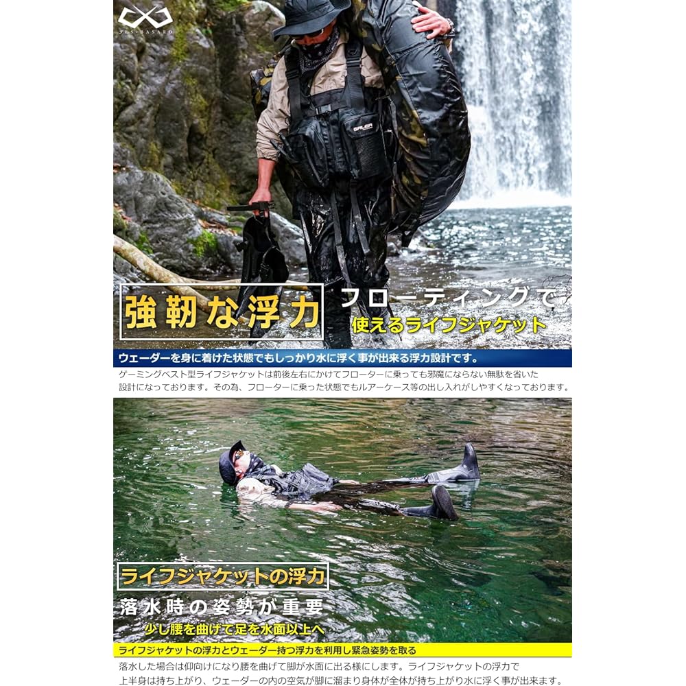 This is a vest type life jacket that can be used in salt water and natural water, produced by Japanese life jacket manufacturer BASARO. This gaming vest type life jacket is equipped with a lot of storage space, making it a model that can be used for long fishing trips. This life jacket is designed as a life jacket in case you fall into the water while wading, and any parts that would reduce buoyancy have been eliminated. The buoyancy part (float) of the life jacket is approximately 70% on the back and 30% on the front. The ratio is such that users can easily lie on their backs on the water surface and float. It can store rods, polarized sunglasses, pliers, lure cases large, medium and small, smartphones, etc. If you want to secure a rod to this life jacket, insert the rod inside the vest and secure it with the strap. This method of keeping the rod is stable and securely fixed, making it very easy to move. A special holder for fishing pliers is installed on the right chest. The gaming vest has D-tubes installed throughout, so you can also attach straps for pliers, etc. There are two lure cases on the left and right, and each storage space also has a zipper-type worm storage. The large storage space on the back is the perfect size for storing large lure cases. Role of the inseam belt: The inseam belt is very important for this gaming vest type life jacket. This belt is designed not only to prevent the life jacket from falling off when you fall into the water, but also to make it difficult to feel the weight of the lure case etc. stored by keeping the life jacket tightly attached to your body. This mechanism is also used in backpacks for mountain climbing, but when the backpack is separated from the body, it becomes easier to feel the weight of the stored items, and when the backpack is in close contact with the body, it becomes harder to feel the weight of the stored items. . This principle is also incorporated into this product. With this inseam belt, you can use it even when the front is open, and when you take a short break or move around, you can leave the front of the vest open. Gaming vest type life jackets are not water repellent. Incorporates dehydration properties. Mesh fabric and dehydration holes are installed throughout the storage space to prevent water from accumulating inside the life jacket storage. In addition, the fabric used for this life jacket is made of a material that does not absorb water, so it will not absorb water and feel heavy. The gaming vest itself is made with 3D cutting, so it fits perfectly to your body. Gaming vest type life jackets are not water repellent. Incorporates dehydration properties. Mesh fabric and dehydration holes are installed throughout the storage space to prevent water from accumulating inside the life jacket storage. In addition, the fabric used for this life jacket is made of a material that does not absorb water, so it will not absorb water and feel heavy. The gaming vest itself is made with 3D cutting, so it fits perfectly to your body. It can also be used as a floating life jacket. This life jacket is designed so that it does not get in the way even if you ride on a floater from front to back and left to right. It also has strong buoyancy that will keep you afloat even in the unlikely event that you fall into water. If you fall into the water while wearing waders, you can lift your body out of the water by raising your upper body and toes above the water. In this product catalog, a model actually wears a life jacket and floats in the water, so please refer to this position.