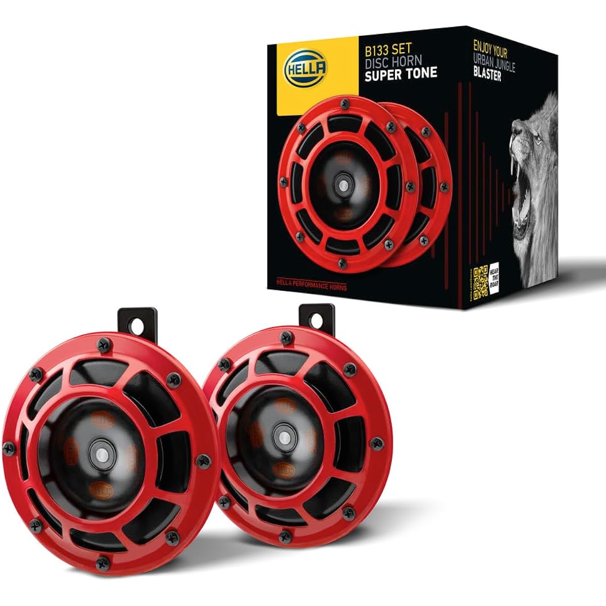 HELLA supertones are powerful and capture the horns of drivers seeking superior attention. HELLA supertones create a FREEWAY warning signal that emits a sharp sound that is excellent for even the most demanding drivers. The HELLA Supertones are made of premium quality with a rugged ABS housing and red protective grille. HELLA'S SUPERTONE Horn Kit includes 2 disc-type horns, relay, mounting hardware and installation instructions. Great with a volume of 118 DB.