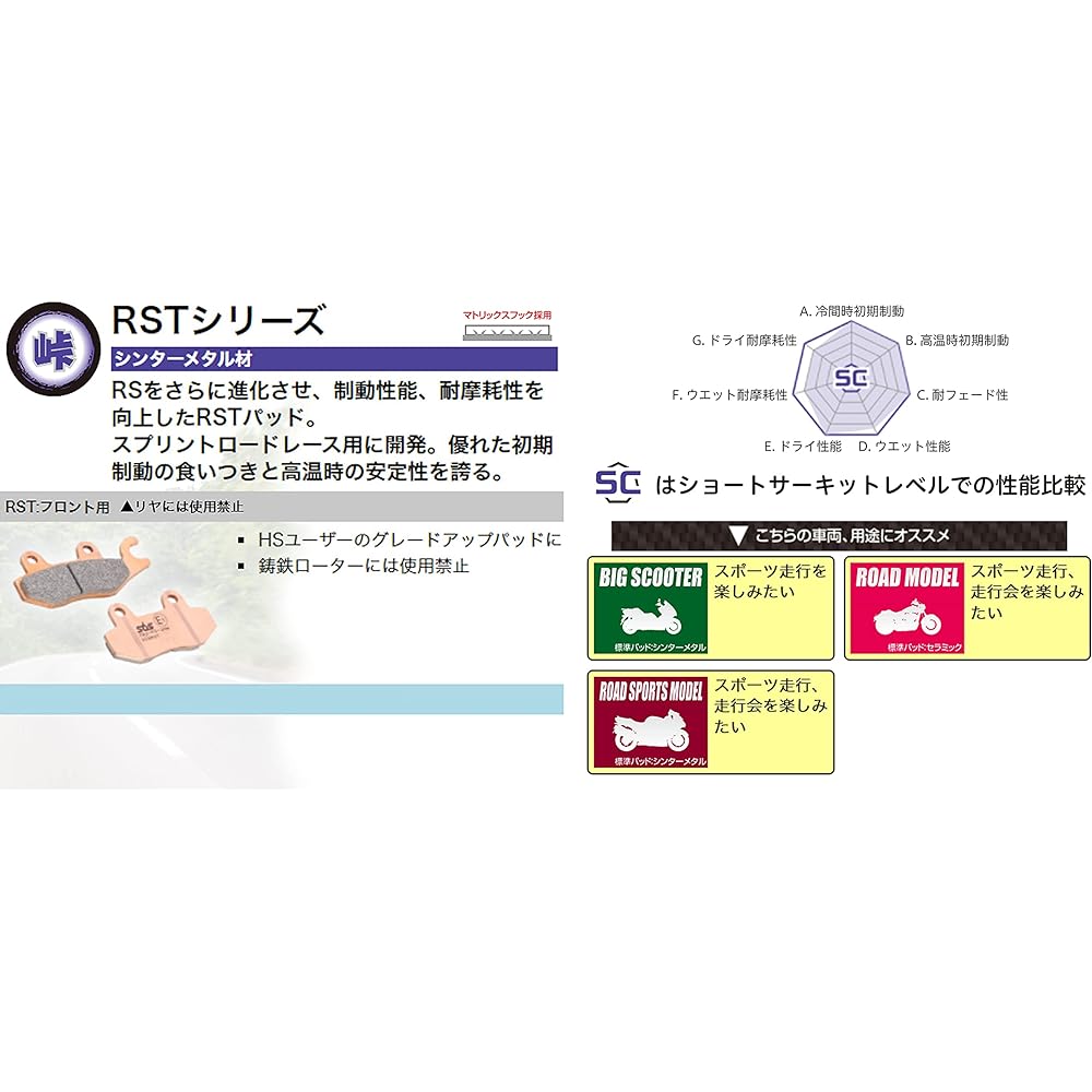 For details on compatible vehicles, please see the "Compatibility Table" or "" Type: RST (Racing Sinter) Material: Sintered Metal For front only Matrix hook adopted Excellent initial braking bite and stability at high temperatures We are proud of