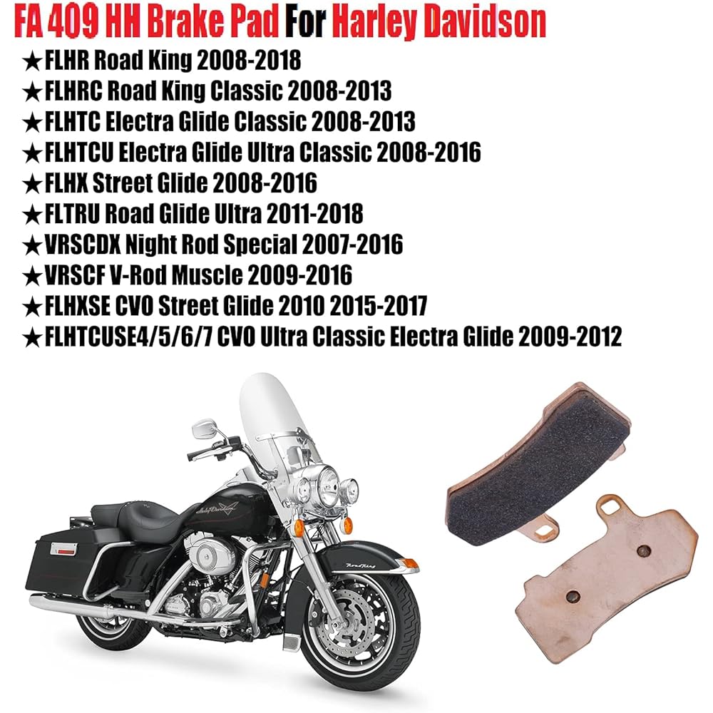 Sintered brake pads 2 x FA409HH front brake pads and 1 x FA409HH rear brake pad. Compatible with Harley-Davidson. FLHR Road King 2008-2018 FLHRC Road King Classic 2008-2013 FLHT Electra Glide Standard 2008-2009 FLHRSE4 Screamin' Eagle Road King 2008 FLHTC Electra Glide Classic 2008-2013. FLHTCU Electra Glide Ultra Classic 2008-2016. FLHTCUL Electra Glide Ultra Classic Low 2015-2016 FLHTK Electra Glide Ultra Limited 2010-2013 FLHTKL Ultra Limited Low 2015-2016 FLHX Street Glide 2008-2016. FLHXS Street Glide Special 2014-2016. FLTR Road Glide 2008-2009. FLTRU Road Glide Ultra 2011-2013 2016-2018. FLTRX Road Glide 2015-2016. FLTRX Road Glide Custom 2010-2013 FLTRXS Road Glide Special 2015-2016. FLHTCUSE3 Screamin' Eagle Ultra Classic Electra Glide 2008 FLHTCUSE4 CVO Ultra Classic Electra Glide 2009. FLHTCUSE5 CVO Ultra Classic Electra Glide 2010. FLHTCUSE6 CVO Ultra Classic Electra Glide 2011. FLHTCUSE7 CVO Ultra Classic Electra Glide 2012 FLHTCUTG Tri Glide Ultra Classic 2009 2013 FLHTK Ultra Limited 2015-2018 FLHXSE CVO Street Glide 2010 2015-2017. FLHXSE2 CVO Street Glide 2011. FLHXSE3 CVO Street Glide 2012. FLHXXX Street Glide Trike 2010 2011 FLTRSE3 CVO Road Glide 2009. FLTRUSE CVO Road Glide Ultra 2011 FLTRXSE CVO Road Glide Custom 2012 VRSCA V-Rod 2003 2005 2006. VRSCAW V-Rod 2007-2009 VRSCD Night Rod 2006-2008 VRSCDX ANN V-Rod Anniversary Edition 2012 VRSCDX Night Rod Special 2007-2016 VRSCF V-Rod Muscle 2009-2016 VRSCR Street Rod 2006-2007 VRSCX V-Rod 2007 VRSCB V- Rod 2005 VRSCSE Screamin' Eagle V-Rod 2005 VRSCSE2 Screamin' Eagle V-Rod 2 2006 VRXSE Screamin' Eagle Destroyer 2006