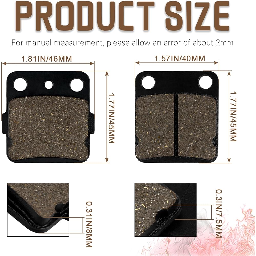 Features: Position: Front and Rear. Material: Semi-metallic organometallic. Dimensions: Front: 39.5 x 45 x 7.5mm(1.56 x 1.77 x 0.30inch) Rear: 46 x 45 x 7.8mm (1.81 x 1.77 x 0.31 inch) Package contents: 6 brake pads (3 pairs). Compatible models: Yamaha Raptor YFM125R 2011-2014. Yamaha Blaster YFS200 2003-2006. Yamaha Warrior YFM350 1989-2004. Yamaha Banshee YFZ350 1988-2009. Yamaha Wolverine YFM350 F 1995-2005. [Note] ★Noise Reduction: High quality materials and anti-noise gasket provide a quiet braking experience. ★Durability: Reduces heat generation and transfer, extending motorcycle brake life in daily use. ★High quality: standard slotting and shimming, excellent bending dynamic braking performance. ★Easy to install: Very suitable for your bike and can be quickly installed in one go. Our Service: The most romantic thing I can think of is seeing you smiling at our products and hoping the breeze will blow away all your troubles.
