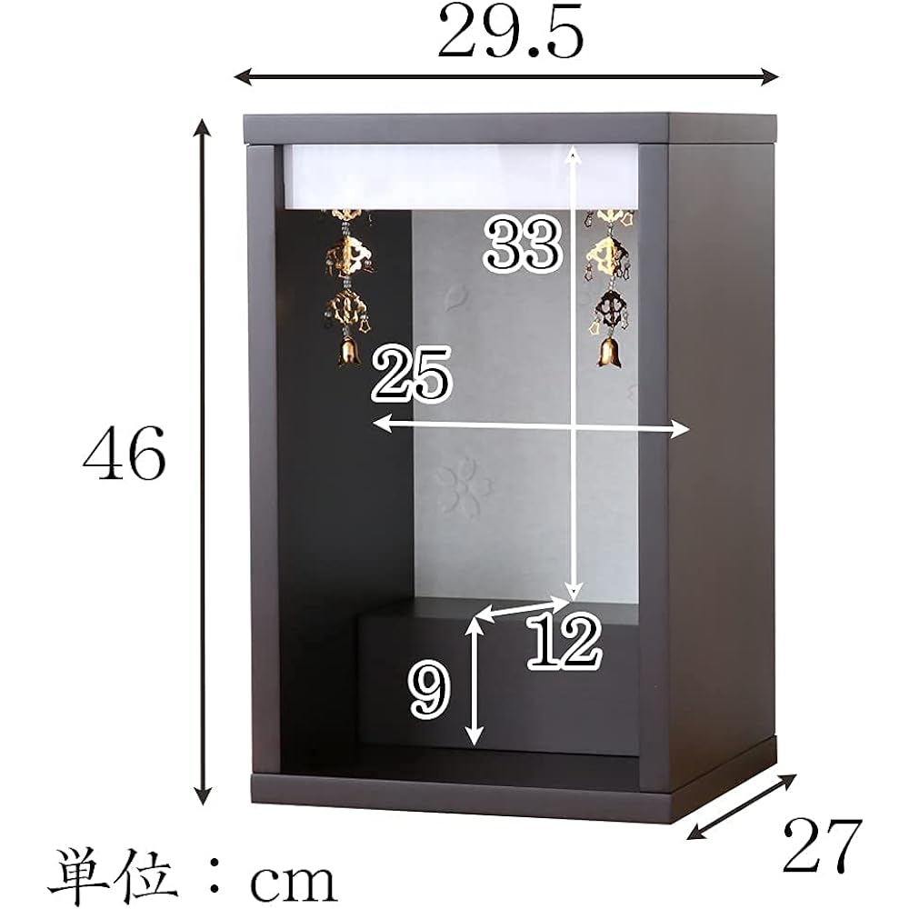 Since it is box-shaped without a door, it can be installed anywhere neatly. The simple design makes it possible to achieve quality that belies its low price. The lightest Buddhist altar at 6kg. Easy to install even for those with limited strength. You can use it as soon as it arrives. Although the design is simple, the curtain and backboard have a subtle cherry blossom design. Not only does it look neat and tidy, but it is also suitable for places where a Buddhist altar cannot normally be placed. Since the main statue stand can be removed, you can also place a large Buddha statue. When the main stand is removed, the height inside is 42cm. You can also enshrine a large Buddha statue. [Size] Width 29.5cm x Depth 27cm x Height 46cm [Weight] Approx. 6kg [Materials] Printed decorative board/MDF (core material), white acrylic board (transom part) [Specifications] Removable main veneer stand, mini gourd included < br>