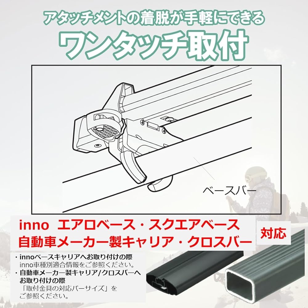 This product is a ski and snowboard attachment that can be used with INNO base carriers (for both aero base and square base). It can also be installed on carriers/cross bars made by car manufacturers (please be sure to check the compatible bar size). By using this product, you can load 3 sets of skis and 2 snowboards. The mounting bracket uses a "memory clamp" that can be fixed with one touch once set. You can easily remove it when not loading it and attach it immediately when you want to use it. It has a "single load" specification that can be used in conjunction with other attachments. The hinge etc. are further strengthened compared to the previous model. The tough construction ensures that it will not be damaged even if it is driven without locking.