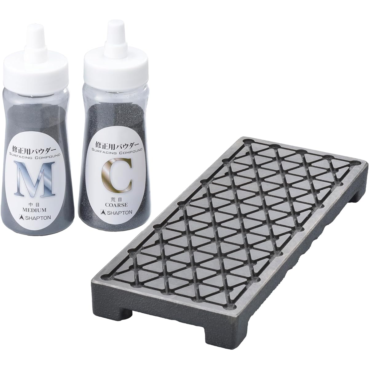 ●A sharp finish that cannot be obtained with rough whetstones or blocks. ●Geometrically patterned grooves enhance the synergistic effect between the powder and the board, resulting in quick and accurate finishing. ●We can also repair whetstones other than ceramic whetstones. ●For slight unevenness, use the included medium-grain powder, and for extreme unevenness, use the included coarse-grain powder to finish quickly.