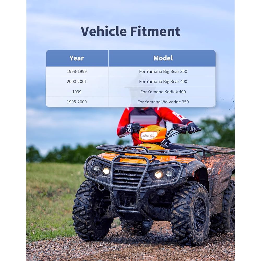 This axle is compatible with the following years and models: 1997-1997 Yamaha 350 BIG BEAR 4X4 4X4 1998-1998 Yamaha 350 BIG BEAR 4X4 4X4 1999-1999 Yamaha 350 BIG BEAR 4X4 4X4 1995-2000 Year YAMAHA 350 Wolverine 4X4 YFM350 4X4. Yamaha 400 BIG BEAR 4X4 YFM400FM/FMC 4X4 2000-2000. 2001-2001 YAMAHA 400 BIG BEAR 4X4 YFM400FN/40FHN 4X4. 1999-1999 YAMAHA 400 KODIAK 4X4 4X4 Package Includes: 1 Front Left and Right CV Axle for YAMAHA Big Bear/Wolverine 350, Big Bear/Kodiak 400.