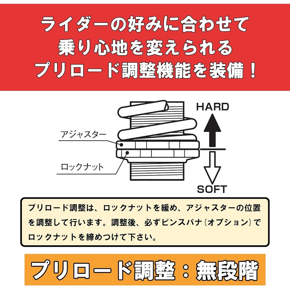 Compatible models CT125 Hunter Cub: All JA55 models/JA65 models Free length 362mm (same as normal) Preload adjustment function: Stepless oil damper type Two-seater compatible Sold as 1 piece Kitaco's original rear shock absorber.