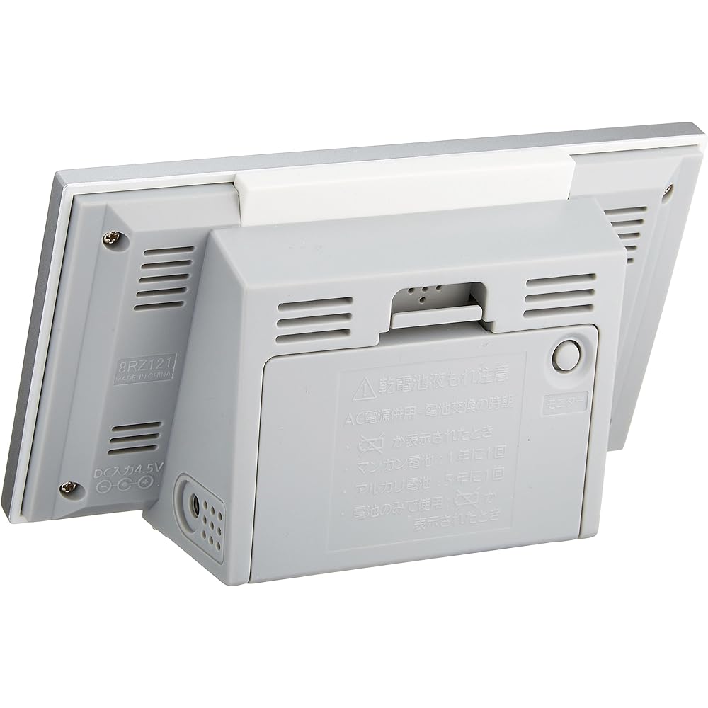 ●Digital radio alarm ●Electronic sound ●Calendar ●Always on light ●Plastic frame ●With 2-stage angle adjustment function ●With temperature display ●With minimum/maximum value display function within 24-25 hours ●With warning display function ( We will inform you about heat stroke, food poisoning, influenza, mold, and dust mites.) ●78 x 138 x 45 mm 1180 g ● 3 AAA batteries ● AC type (Usually used with AC power, dry batteries are for backup) ● For backup (3 AAA manganese batteries) ●Battery replacement notification function ●Battery life approximately 1 year ●2-level angle adjustment