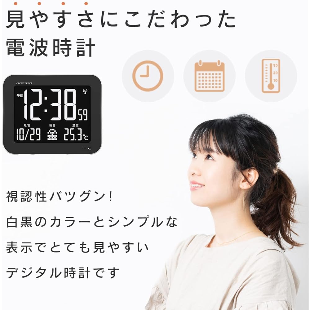 ADESSO Digital Clock, Wall Hanging, Table Clock, Stylish, Radio Wave, Can Be Used as a Stand, Large, Date Display, Temperature, Alarm, Black