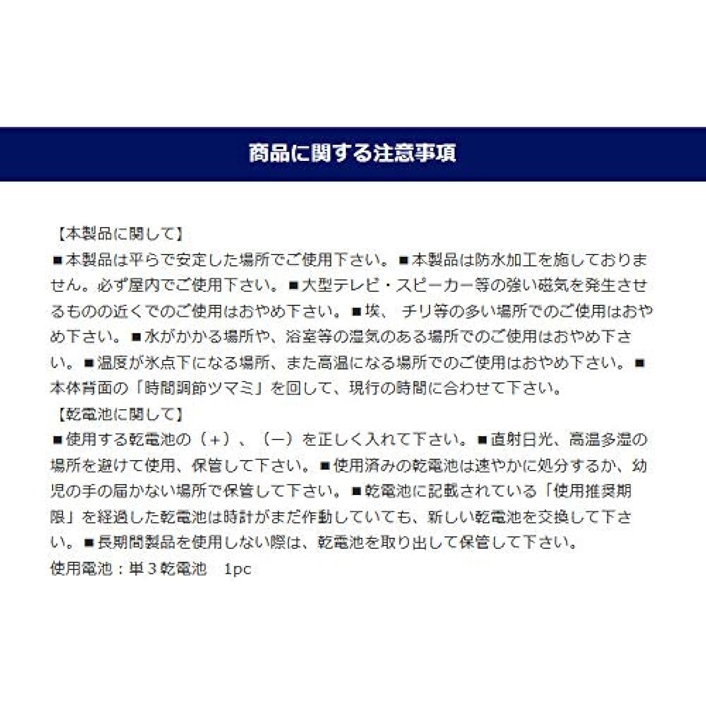 This is a table clock that can be used when you are renting and cannot hang it on the wall, or when you want to display it on a shelf with your interior decoration. Since it has a sweep movement, it is also suitable for bedrooms. It features a classic design that can be used by both men and women, and a second hand color that differs depending on the body color. *Please note that the price is different for chrome color only. *Please check the precautions before purchasing. Product Precautions Regarding this product Please use this product on a flat and stable surface. This product is not waterproofed. Please use indoors. Please do not use the product near objects that generate strong magnetism, such as large TVs or speakers. Please do not use it in a place with a lot of dust or dirt. Please do not use it in a place where it will get wet or in a humid place such as a bathroom. Please do not use it in places where the temperature is below freezing or where it gets hot. Turn the "time adjustment knob" on the back of the main unit to set it to the current time. Regarding dry batteries, please insert the (+) and (-) of the dry batteries correctly. Please use and store away from direct sunlight and places with high temperature and humidity. Dispose of used batteries immediately or store them out of reach of children. If the battery has passed the "recommended expiration date" written on the battery, please replace it with a new one, even if the clock is still working. If you do not use the product for a long period of time, please remove the batteries and store it.