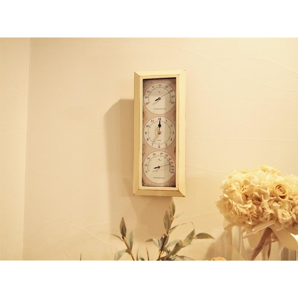 MYS Wall Hanging Clock, Made in Japan, Temperature and Hygrometer Included, Antique Processing, Analog, Handmade, Vertical, Ivory, Antique Clock YT-902