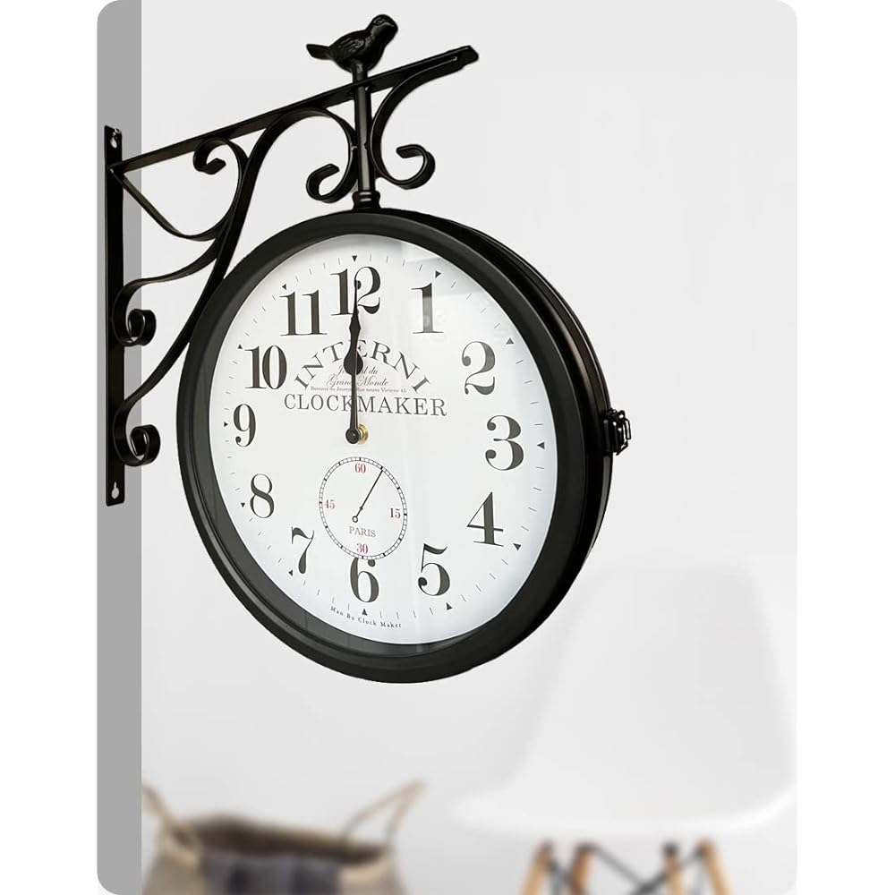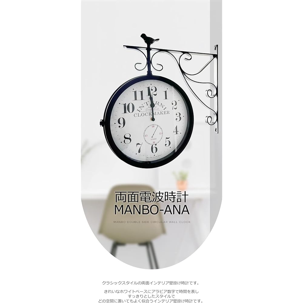 - Model Name: Double-Sided Radio Controlled Wall Clock Manbo-ana Radio Controlled Clock Silent Present Wall Clock Stylish Wall Clock Scandinavian Clock Interior - Material: Glass, Metal - Color: Black - Standard: Width 44.5cm Height 46cm - Weight: 3000g - Function: Radio wave reception A marine-look radio-controlled wall clock with a lovely ivory tone dial. This radio-controlled wall clock can be confidently recommended for white or marine-style buildings. It is ideal for white-toned buildings, but also for beauty salons, aesthetic salons, cafes, and restaurants. Recommended for chic and modern rooms. It uses a highly silent movement, so you won't be bothered by the noise. Adopting a radio clock, there is no need to worry about setting the time and there is less need to climb high places.