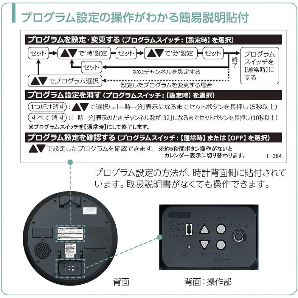 Chime will notify you of your favorite time. Perfect for small offices and cram schools. ◆Up to 32 channels of time can be set You can set up to 32 channels of the time you want the chime to sound. You can manage your schedule in detail. For the chime, we use the familiar "Westminster chime". ◆Universal design font with excellent readability Uses a universal design font jointly developed with Font Works Co., Ltd. We have thoroughly pursued the ease of reading the time as a wall clock that requires instant reading. ◆Simple explanation sticker that can be operated without looking at the instruction manual An operating instruction sticker is attached to the back of the watch so that you can change or add time settings at any time even if you do not have the instruction manual at hand. ◆Volume control You can finely adjust the volume of the melody and alarm sound. ◆Fully automatic calendar This calendar does not require correction even in leap years. ◆Time monitor You can listen to the melody and chime on the hour even when it's not on the hour. ◆Gypsum board Comes with hanging hardware compatible with gypsum board. ◆Battery run-down notice You will be notified when the battery runs out. There are two types: one in which the second hand stops at the 12 o'clock position, and one in which a low battery mark is displayed on the digital LCD screen. ◆Sweep seconds The second hand moves smoothly and continuously. ◆Good Night Second Hand The second hand automatically stops at the 12 o'clock position when the darkness falls below a certain level due to the function of the light sensor. It has the advantages of increasing reception sensitivity since there is no noise when receiving radio waves, and battery life lasts longer. ◆Standard radio clock A clock that receives radio waves with accurate time information and automatically adjusts the displayed time. When using the product, place it near a window where it is likely to receive radio waves, and avoid places where radio noise is generated. ●When not receiving radio waves, it operates with quartz precision. ●Please also note that it may not be possible to receive messages accurately in the following locations.・Inside buildings, in the valleys of buildings, and underground.・Near high-voltage lines, TV towers, and overhead train lines.・Near home appliances and office equipment such as televisions, refrigerators, air conditioners, air purifiers, computers, and fax machines. - Locations where radio interference occurs, such as construction sites, near airports, or areas with heavy traffic.・Inside the vehicle. (Cars, trains, airplanes, etc.) - Near other objects that generate radio noise.・On or near metal furniture such as steel desks. *Depending on the conditions, it may be possible to receive the service even in areas other than the areas where it is available.