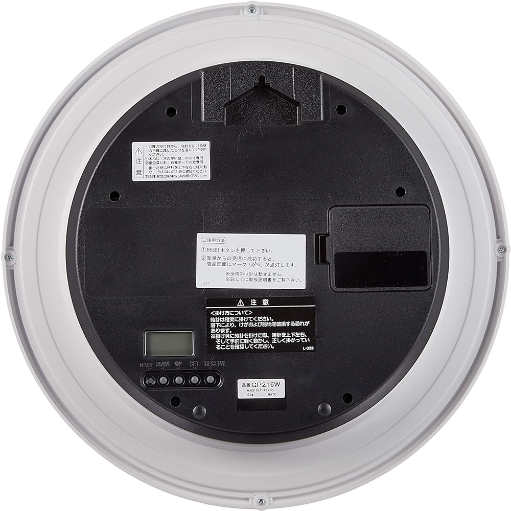 Body size: 33.5'33.5'4.7cm Materials: Plastic frame (white pearl coating), Front: Glass Country of origin: Thailand Movement: Satellite radio wave correction function/Satellite radio wave OFF included Accessories: Single battery 3 alkaline batteries ×3) Sweep second hand Battery warning Comes with plasterboard metal fittings