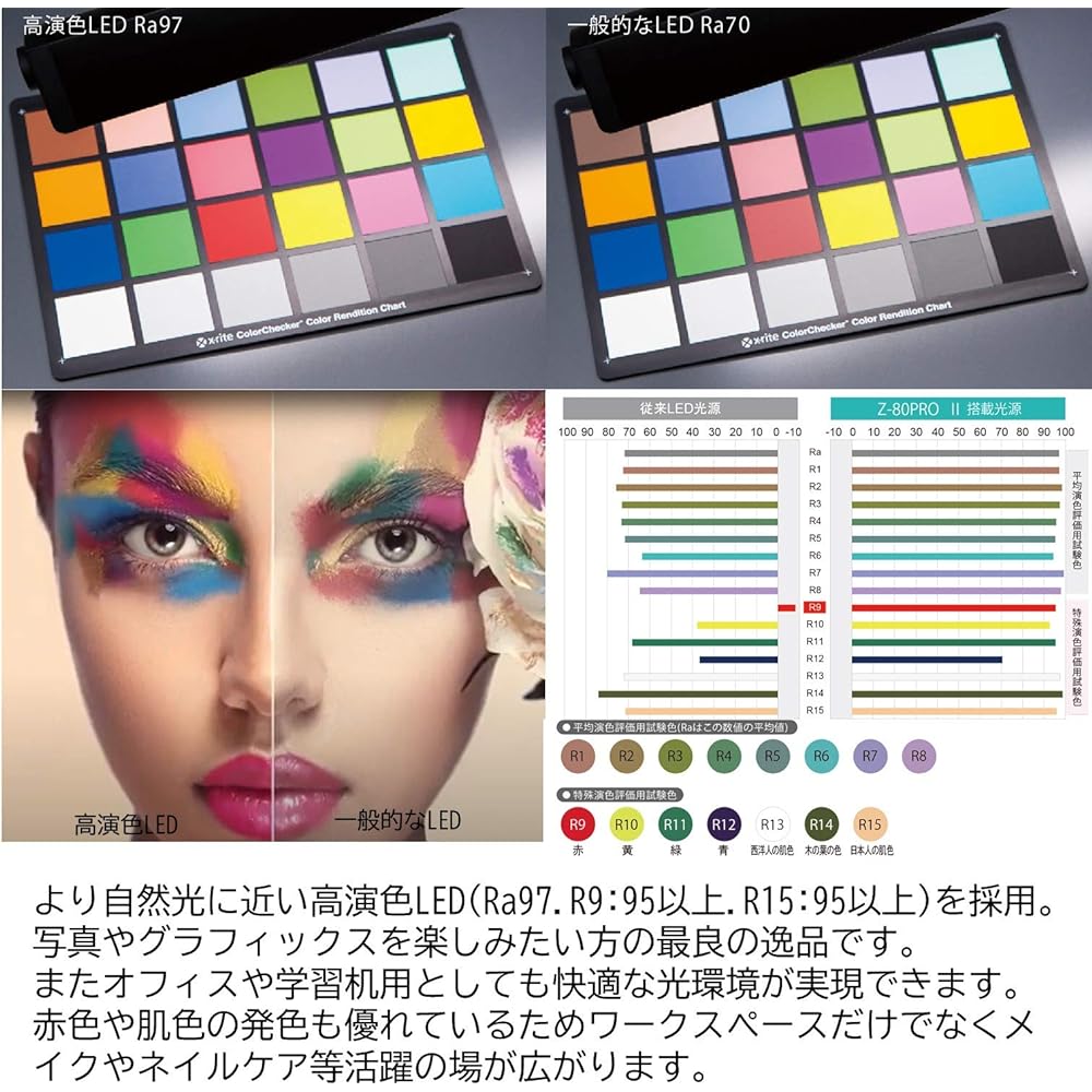 ■Compared to the previous model, the brightness has been increased and the popular top tightening clamp is standard equipment, now available at an affordable price! ■Equipped with a high color rendering LED that is closer to natural light. The best item for enjoying photos and graphics. Stepless dimming from 100% to 10%, double-click to instantly turn on 100%. Comes with a last memory function that remembers the brightness when the light was previously turned off. ■Uses high color rendering LED with excellent color reproducibility ■Equivalent to 100W incandescent lamp ■Illuminance directly below the center: 1,900Lx ■Light source: Fixed color temperature type (5000K daylight white) Ra97 ■Ra97-high color rendering model ■Soft start function ( 100~10% stepless dimming)■Double click 100%■Last memory function ■Clamp: Z-A17 (same color specification) included (can be installed up to 45mm thick) Hex wrench included ■Spring: Black finish ■Power source: AC adapter Attachment/cord length: 1.8m■Short arm (72cm)■Light source color: Daylight white