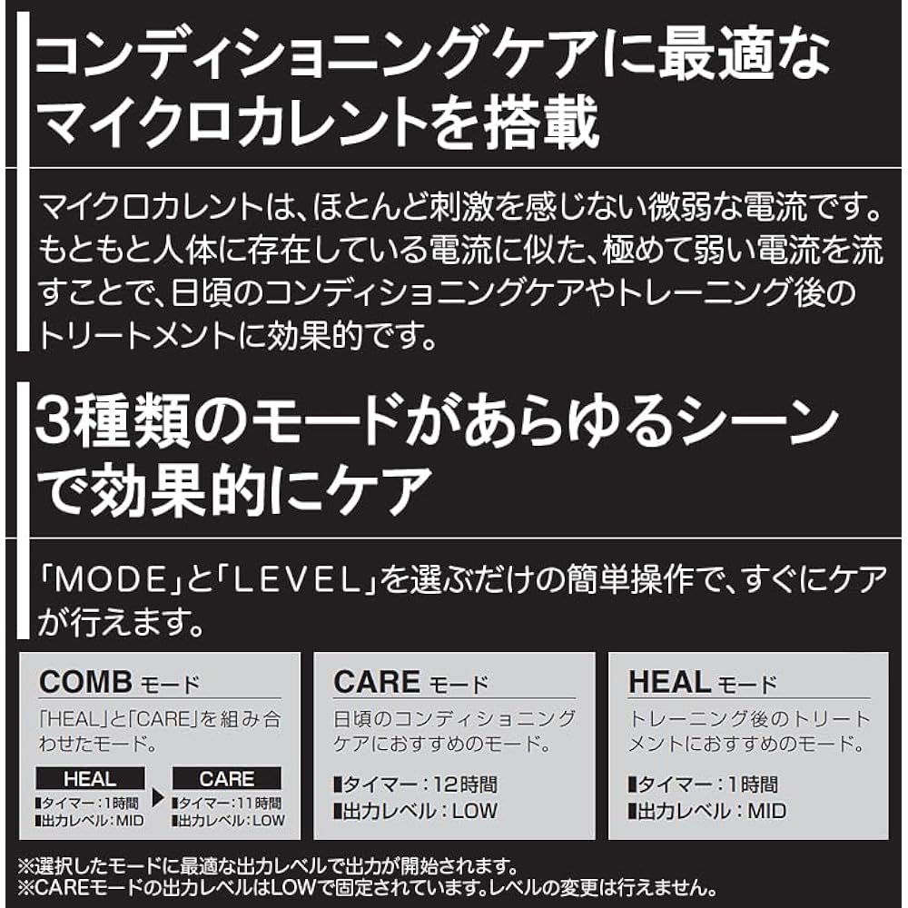 Equipped with microcurrent (weak current) that is ideal for conditioning care. A portable microcurrent that is ultra-lightweight and compact, yet can be used continuously for 12 hours. Ultra-lightweight and compact design that can be used anywhere. Care can be provided at any time, whether at home, in the field, or while traveling. Microcurrent (weak current) works effectively, allowing you to properly care for your body. ITO's technology that supports athletes on the world stage will support your conditioning care. Microcurrent is a weak electric current that causes almost no stimulation. By passing an extremely weak electric current similar to the electric current that originally exists in the human body, it is effective for daily conditioning care and post-workout treatments. 3 types of modes provide effective care in all situations You can perform care immediately by simply selecting "MODE" and "LEVEL". Lithium-ion battery allows continuous use for up to 12 hours. Despite its ultra-compact size, it has outstanding stamina, allowing you to take care of yourself even while you sleep.