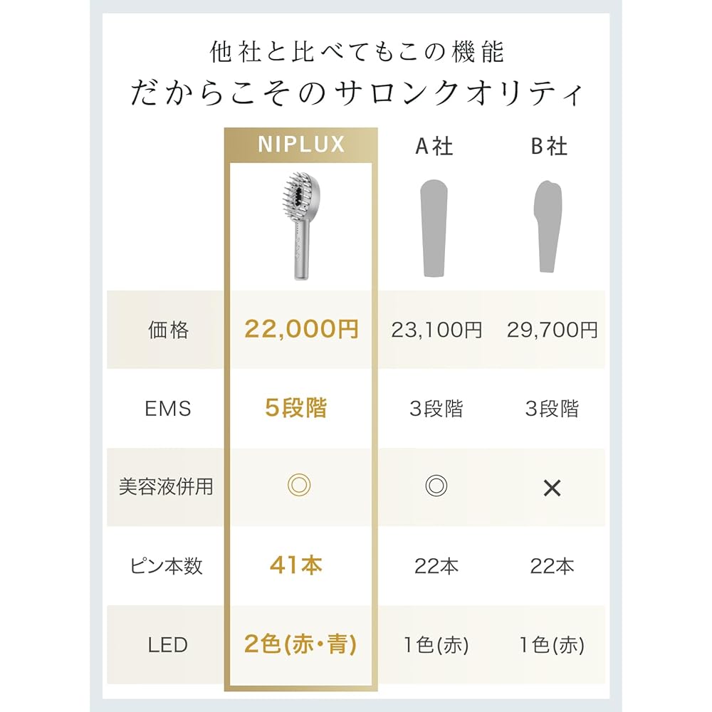 ``Facial beauty device specializing in lift care'' The scalp and face are connected by a single layer of skin that connects the muscles that are important for facial expressions. Lift care is more efficient by lifting from the scalp muscles with the EMS lift brush. Electrically stimulates the scalp and face, which tend to become stiff, and targets the muscles. [EMS stimulates muscles that cannot be reached by human hands] Adopts NIPLUX's unique EMS waveform "DBN Technology". It is a delicate and comfortable stimulation, and by building a low frequency different from normal EMS, it can firmly transmit electrical stimulation to the scalp muscles. High-power EMS low frequency waves with a maximum voltage of 200 V apply electricity to muscles that are difficult to reach with your hands, and you can experience an addictive stimulation that feels like being stabbed by a firm body. [Equipped with 2 modes for scalp and face/body] HIGH / Scalp mode: Strong stimulation EMS mode for scalp care. LOW / Face/Body Mode: Low stimulation EMS mode that is safe even for first-time users. The EMS level can be adjusted to 5 levels for each, so you can use it according to your preference. Just like muscle training, we continuously change the stimulation to target the scalp and facial muscles. *There are individual differences in how EMS is felt. *When you start using it or until you get used to it, please use it gradually from level 1. [Vibration Stimulation] Achieves high-speed vibrations of up to 9,000 times/minute, and combines EMS and vibration to deliver stimulation to even harder scalp and facial muscles. The vibration can be turned on and off freely, so even those who are not good at vibration can use it with confidence. [Authentic LED light] Equipped with high-output LEDs that are attracting attention in beauty salons, you can perform various skin care treatments just by shining light on them without feeling any pain or heat.Equipped with 16 LED lights, Adopts NIPLUX's unique structure that widens the irradiation range.By delivering LED light evenly to a wide area of the skin, it provides full-fledged care from the scalp to the face. >