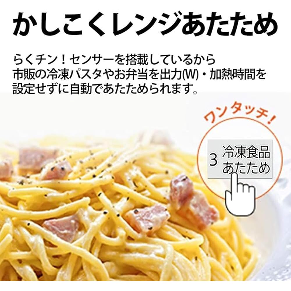Easy to use with large buttons 2. Easy to use! Automatic heating with sensor Three frequently used buttons are arranged in a large, easy-to-see, and easy-to-use manner. Easy! Warm up automatically with the sensor. Assess the doneness of the food using the steam generated from the food! Automatically heats commercially available frozen foods such as frozen pasta and lunch boxes just right. Easy-to-read white backlit LCD. Easy-to-clean flat interior. Easy to wipe and take out