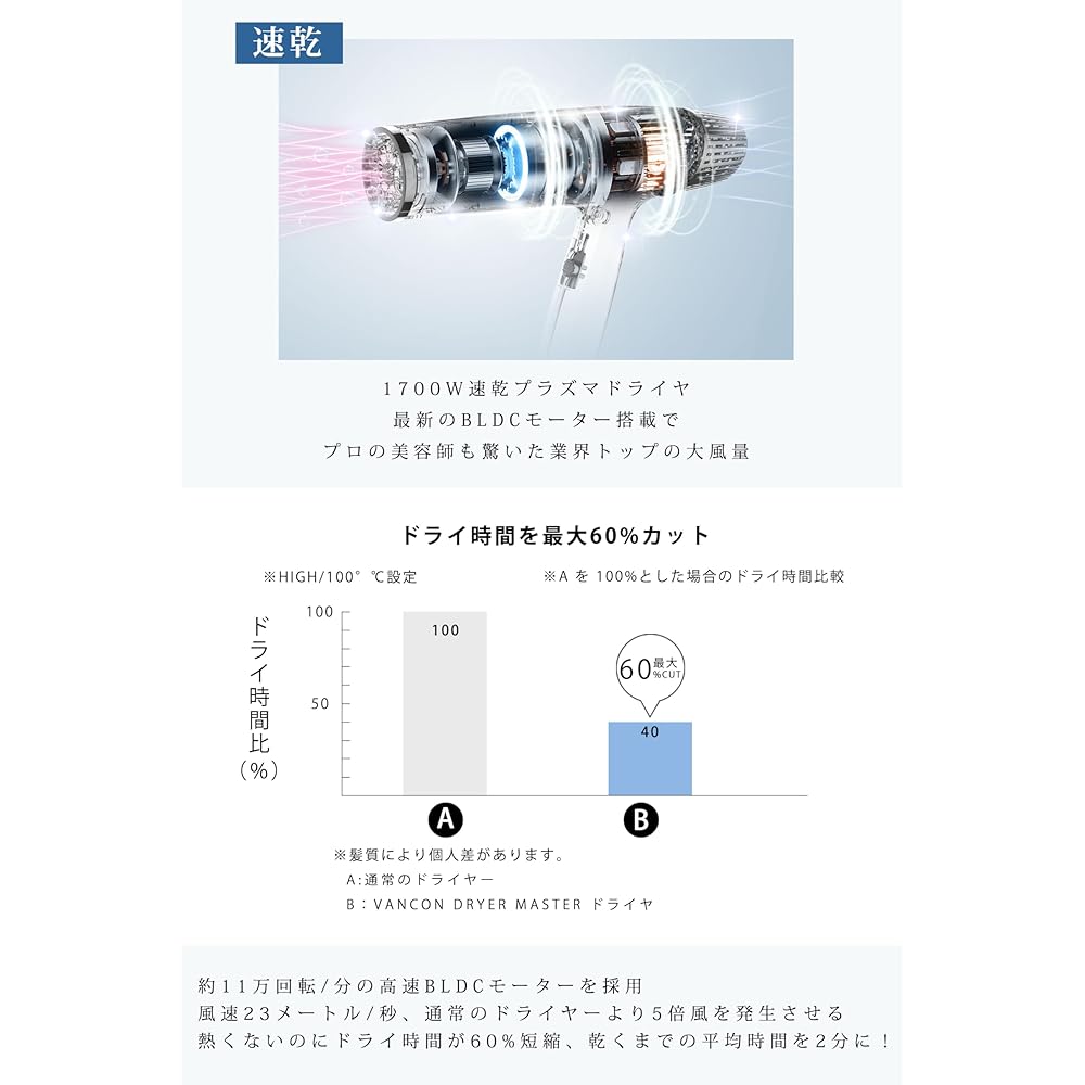About this product: Excellent quick drying and 60% reduction in drying time] The VANCON DRYER MASTER hair dryer uses a 1700W high-speed BLDC motor of approximately 110,000 revolutions per minute, and has an industry-leading large air volume of 23 meters per minute, surprising even professional hairdressers.