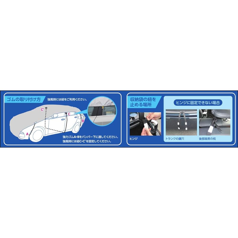 A safe design that gently protects the car body! Thoroughly protects against winter frost and summer heat! Strong rubber: Double covering made of high-purity natural rubber and polyester. 1When putting on the cover, simply stretch and unfold the cover from the storage bag. 2 When storing, roll it up from the front and put it in a bag. 3 Covers make it less likely to be stolen. 4 When handling the cover, it does not touch the ground, so it is less likely to damage your car with pebbles or sand. 5 The storage bag can also hold aprons and gloves at the same time. 6 Storage bags can be removed and removed as needed. ●How to use 1. Open the trunk and set the storage bag's string on the hinge inside the trunk. 2. Remove the storage bag from the trunk. Adjust the length of the bag so that when the trunk is closed, it will be about 5 to 10 cm lower than the opening. 3. Pull the cover out of the bag. Then just cover the front and you're good to go! 4. Just cover the back too. 5. As you can see, it's all done in just 15 seconds!