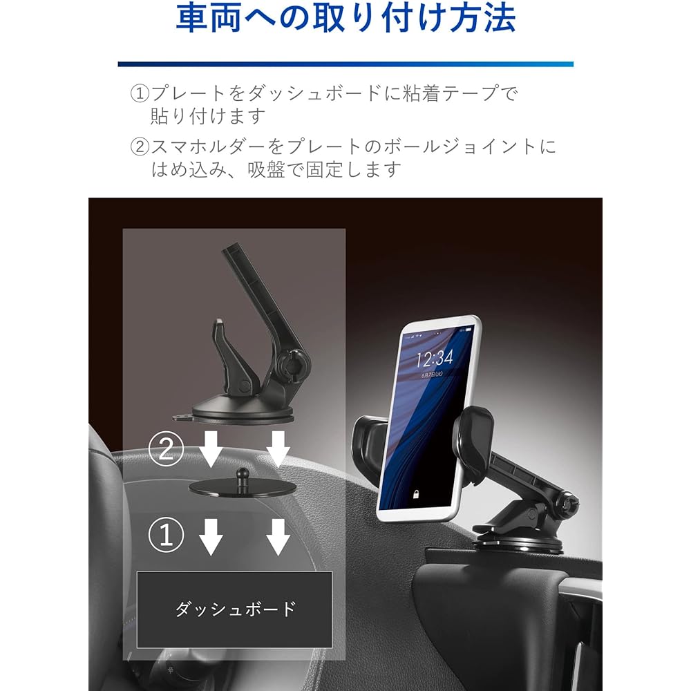 Smartphone holder equipped with a reliable double lock function that prevents the holder from falling off. Adopts a double lock mechanism with a suction cup and ball joint to prevent the holder from falling off. In addition to fixing with the suction cup, the included special plate can be joined to the ball joint. This allows for a strong installation. Even if the suction cup should come off, the ball joint prevents it from falling off. ●Easy one-handed quick hold If you first set the holder arm to match the width of your smartphone, you can easily hold it with one hand from then on. Just press your smartphone against the inside of the arm and the spring force from the side will hold your smartphone. In addition, the structure allows you to release the hold by simply pulling the held smartphone toward you, so it can be easily removed without any hassle. *If the hold feels weak, please set the width one step tighter. *If you are using a smartphone cover made of soft material, it may be difficult to remove your smartphone from the holder. ●You can choose the position of the holder By changing the arm, you can choose between a position where the smartphone is difficult to see when driving (super low position) or a position where there is little movement of the viewpoint (regular position). ●The angle and orientation of the holder can be adjusted.By joining the holder part and the base with a ball joint, the angle can be adjusted up, down, left and right by 55 degrees. The suction cup base can be rotated 150° with the suction cup attached by releasing the lock lever. ●Long arm allows installation even from the back of the dashboard The arm that connects the holder from the base is long, making it easy to reach even if the suction cup is attached to the back of the dashboard. It also features a wide range of motion and a wide range of adjustment. ●Can be held while charging The structure allows you to hold your smartphone with the left and right arms, so you can hold a smartphone with the charging terminal at the bottom while charging it. *If the charging terminal is on the side, you may not be able to charge while holding it. (The maximum height of the left and right arms that come into contact with the smartphone is approximately 35 mm) ●Before purchasing - This product is a product that attaches the special plate that comes with the car body with adhesive tape, and then attaches the main body on top of it.・A flat surface with a diameter of 62 mm or more is required for pasting the plate. - Do not attach the suction cup of this product to any location other than the included special plate.・Cannot be pasted on locations where the main unit faces downwards, curved surfaces, flocked or fabric surfaces, or large uneven surfaces. - The size of the smartphone that can be held is 55mm to 88mm in width and 15mm or less in thickness. Compatible with items weighing less than 250g. *Even if the case is attached, it can be used as long as it is within the size that can be held. *Depending on the position of the fall prevention ring and the shape of the case, it may not be possible to hold it stably. *Depending on the model, whether a case is attached or not, and the shape of the case, it may interfere with the volume control button, power button, etc. - Do not install on dashboards made of genuine leather, synthetic leather, or soft skin. Doing so may damage the mounting surface or leave mounting marks. *Representative car models with dashboards that cannot be installed (as of August 2022) ・Toyota: RAV4 (H31.4~), Harrier ・Nissan: X-Trail (R4.7~) ・Honda: Step Wagon (R4.5~) ・Mazda : General・Lexus: General・Imported cars: General ●Notes・Using a smartphone while driving is prohibited by law. Please stop in a safe place before operating.・Do not attach it to the windshield, side glass of the driver's seat or passenger seat, or in a place that will obstruct the forward view, as this is a violation of the "Safety Standards for Road Transport Vehicles."・This product is for use inside a car. Do not use for any purpose other than its intended purpose. - Do not install it in a location where it will interfere with airbag activation or driving.・Before use, be sure to make sure that this product or smartphone, etc. is firmly fixed. There is a risk of it falling off or falling. - Do not use on vigorous driving or rough roads.・Do not leave your smartphone in the car. Safety Warning ●Before purchasing - This product is a product that attaches the special plate that comes with the car body with adhesive tape, and then attaches the main body on top of it.・A flat surface with a diameter of 62 mm or more is required for pasting the plate.・Place the suction cup of this product on the included special stick.