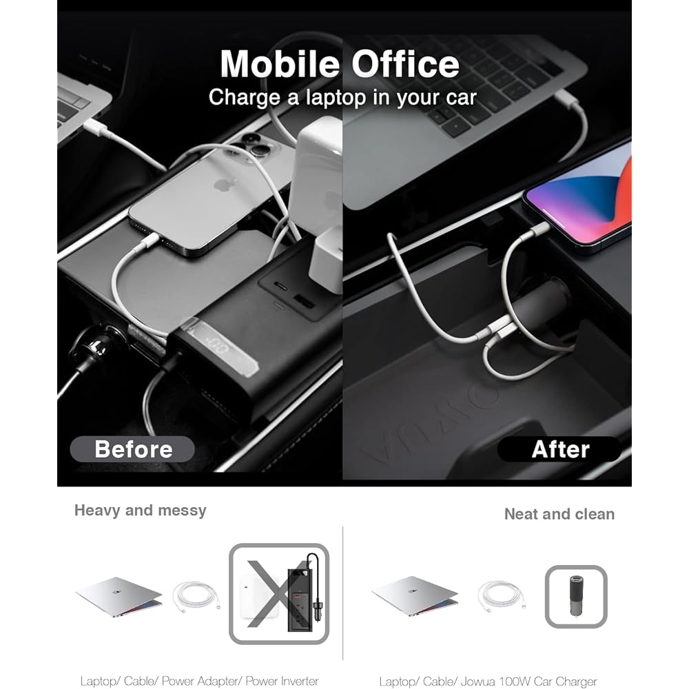 ①100W powerful charging: The Type-C port supports up to 100W, allowing you to charge your laptop in the car. ②Dual Port Output: Equipped with dual USB-C PD 3.0 and USB-A QC 3.0 ports, charge two devices at the same time. ③Multi-professional safety system: Fully protect your car and charging devices. ④Compact size and elegant design: Matte finish fits Tesla interior and is compatible with Jowua armrest organizer. ⑤Customer Service and 4 Year or 100,000 Mile Extended Warranty: JOWUA Inc. provides complete customer service for our products and optionally extends the standard 1 year warranty to 4 years or 100,000 miles by registering the product. Extend to miles.