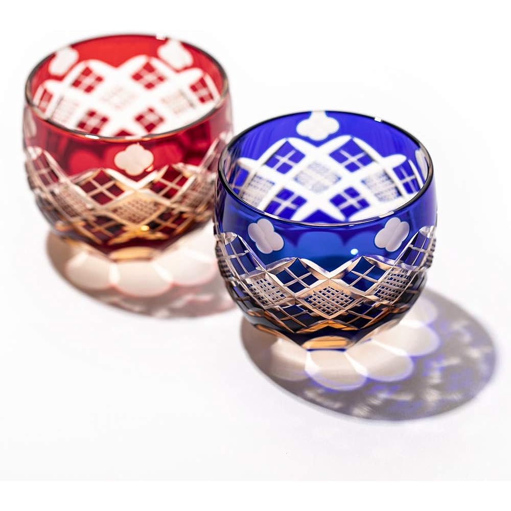 [Taimuro Kobo Official] Edo Kiriko Yotsuba with Yarai Uoko crest pair of drinking glasses (Amber red, Amber Ruri) TB94400ARB in wooden box Made in Japan
