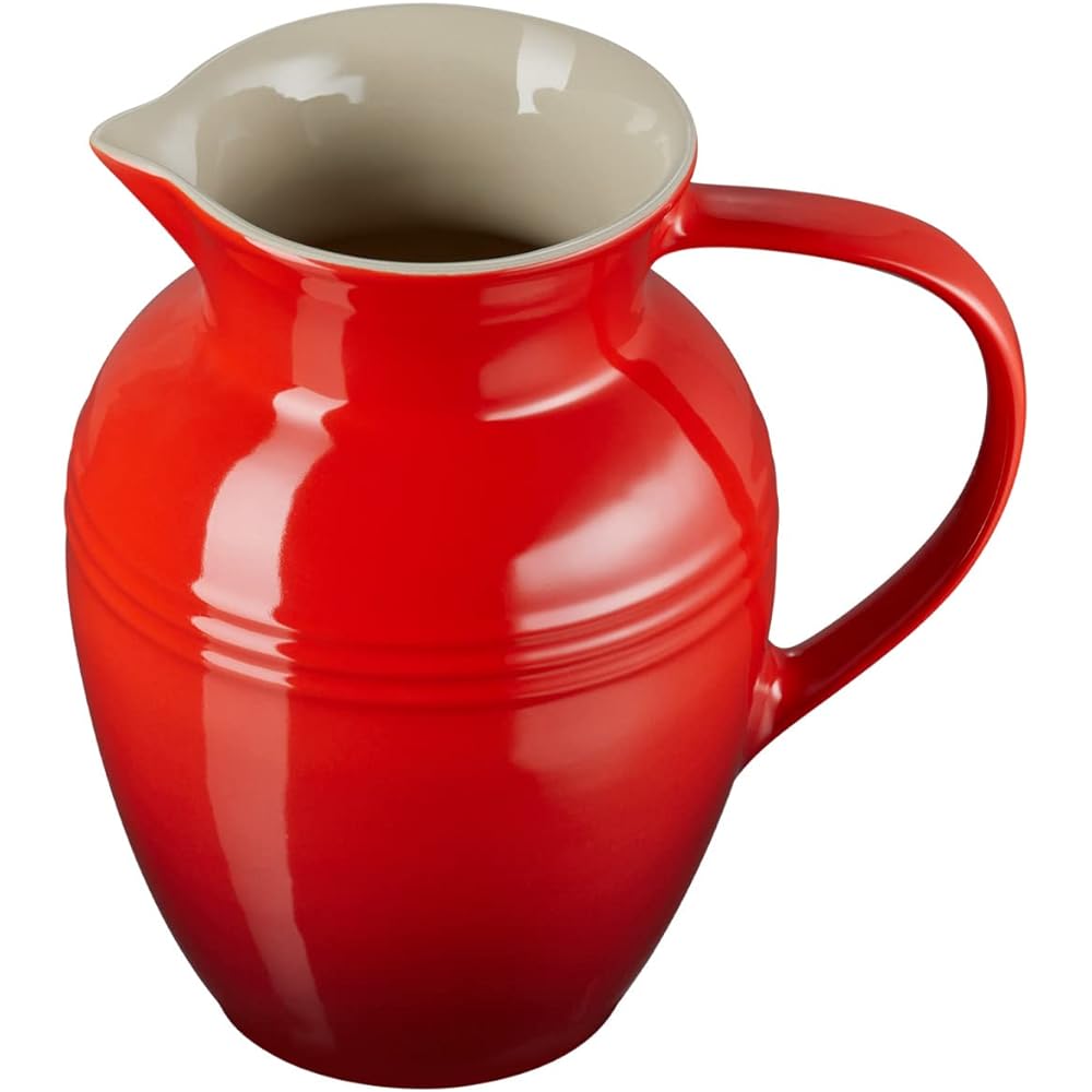 Adds elegance to any table. Le Creuset stoneware pitchers are suitable for both iced and hot drinks. It can handle both ice-cold temperatures and boiling temperatures. When not in use for drinks, this 2-1/4 quart stoneware pitcher can be decorated with flowers and makes a striking centerpiece. Le Creuset cookware, which has supported French chefs for a century, features striking bright colors and a variety of shapes and sizes to suit different dishes. Each enamelled stoneware is expertly finished by hand. Safe to wash in the dishwasher, but hand washing recommended. Made in France. 3 lbs. 8" wide x 9" high (including handle). Product Features Lead-free stoneware is fired at approximately 2000°F for unparalleled strength and durability. The enamelled surface is non-porous and prevents chips, cracks, and scratches. Easy-to-clean porcelain enamel surface resists odors and stains. Beverages will not react to the enamel finish. Bright color selection allows it to match with almost any home decor. You'll want to pour something festive from this colorful Le Creuset stoneware pitcher. Its porcelain enamel glaze is baked on at high heat, allowing it to go from the freezer to the microwave or even the oven (to 500 degrees F). Mix up a frosty batch of sangria or some steaming Irish coffee--either way, this pitcher's generous lip and handle makes pouring graceful and drip-free. What little cleanup remains is easily taken care of in the dishwasher. --Schuyler Ingle