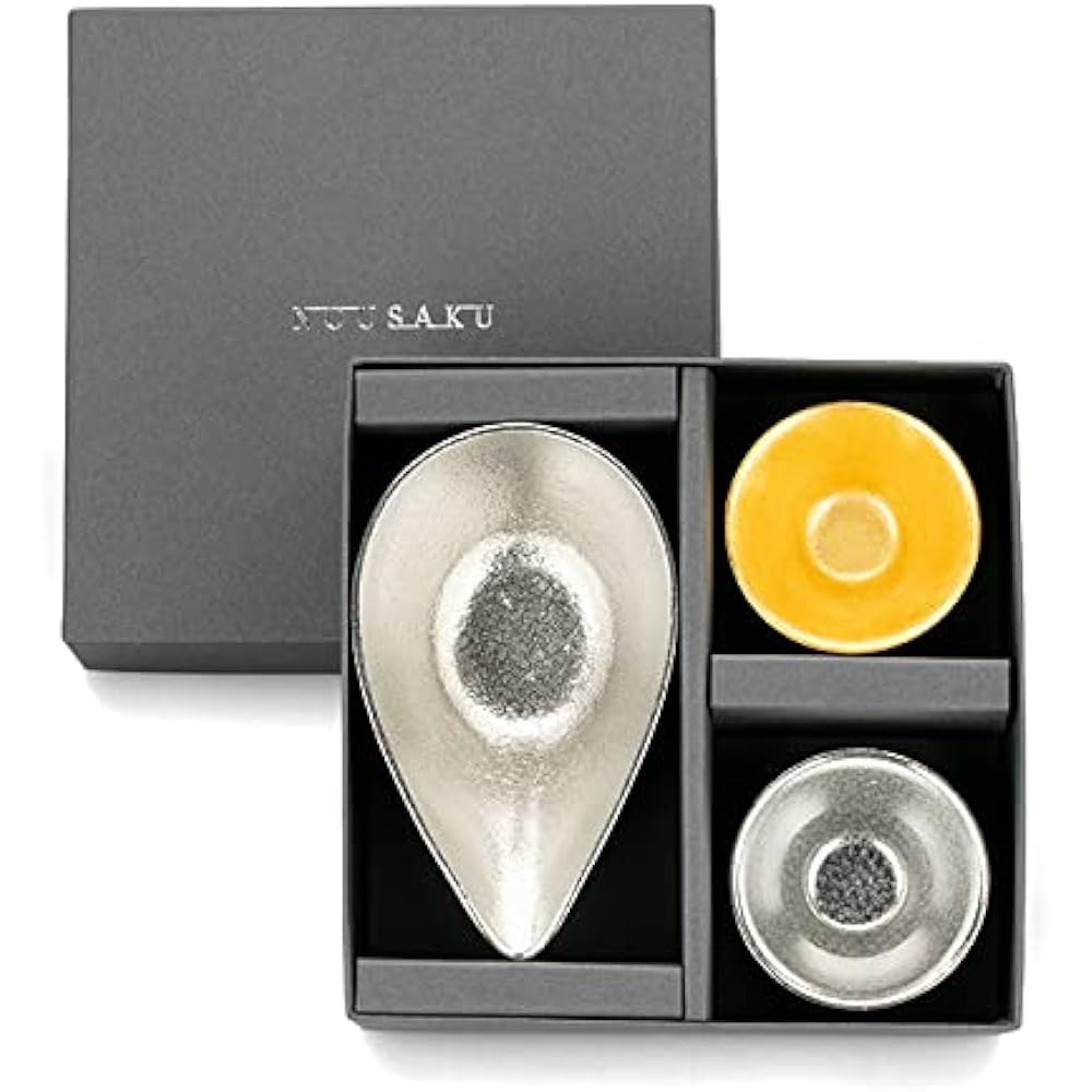 A set of 100% tin Katakuchi - 1 large cup and 2 simple shaped sake cups - 1 tin and 1 piece of gold leaf. Tin is a metal that has been used for sake and tea utensils since ancient times, and it is said that ``water kept in a tin container will not rot'' and ``it will remove the unpleasant taste of alcohol and make it more delicious.'' In addition, because it has good thermal conductivity, placing it in the refrigerator for 1-2 minutes will cool the container itself, allowing you to enjoy cold sake even more deliciously. Each piece is finished by hand by craftsmen. Since it is a 3-piece set, it is also recommended as a gift.