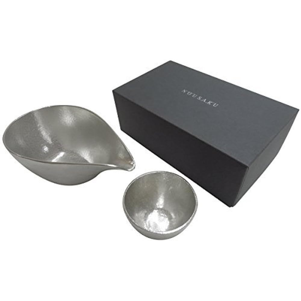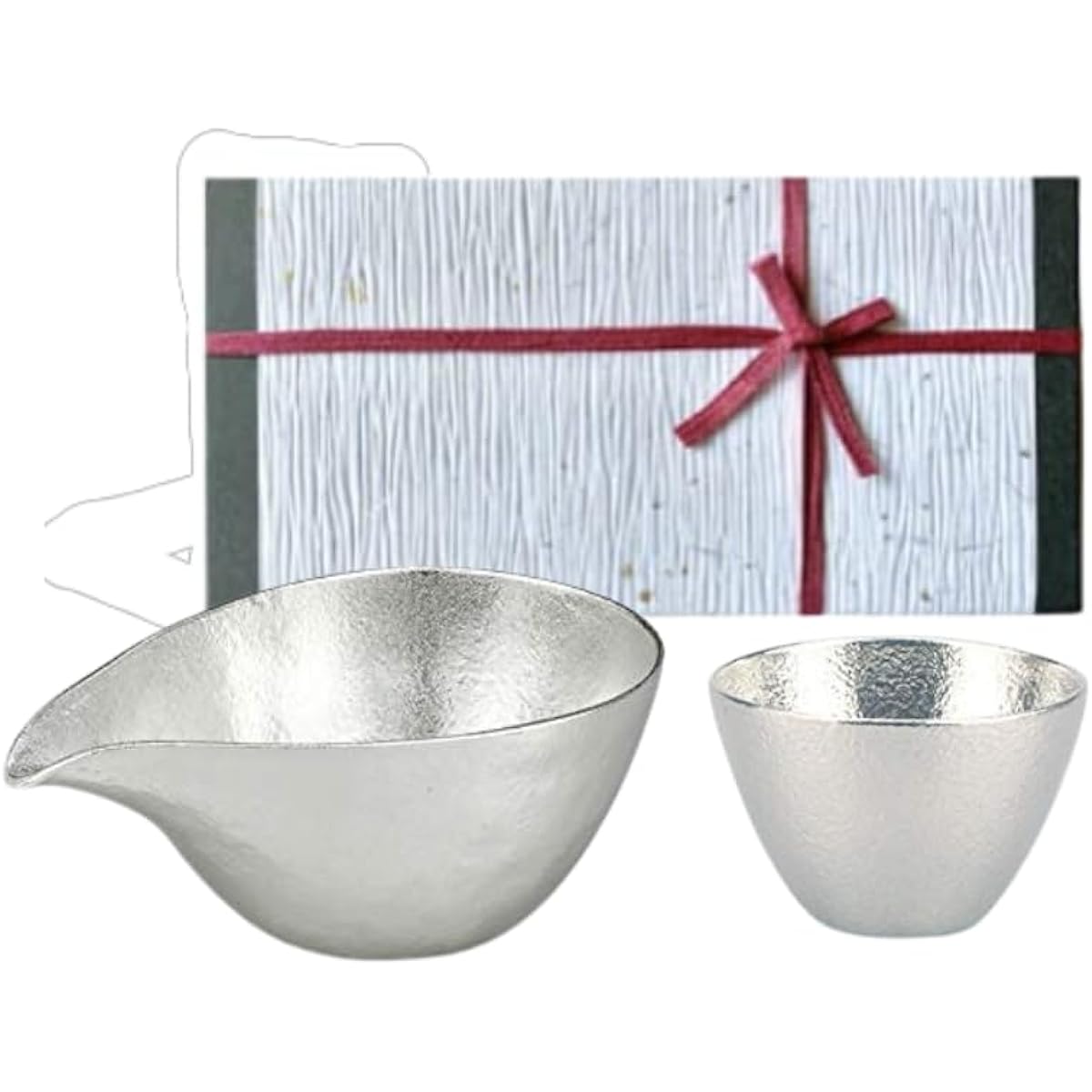This sake set is made of tin and has antibacterial properties and can be safely used as tableware. This 100% tin katakuchi is recommended for those who want to enjoy a mellow-tasting drink. Tin is a metal that has been used for sake and tea utensils since ancient times, and it is said that ``water kept in a tin container will not rot'' and ``it removes the unpleasant taste of alcohol, making it more delicious.'' By pouring it into one mouth, the unpleasant taste of alcohol will be removed and you can enjoy the drink even more deliciously. It also has good thermal conductivity, so it is recommended for cold drinks. Furthermore, an orthodox sake cup with an open mouth is perfect for fresh, refreshing, and smooth sake. In particular, this sake cup goes surprisingly well with refreshing sake types such as regular sake, honjozo sake, and raw sake. The shape makes it easy to pair with other sake. It is wrapped in Japanese paper. Each piece is finished by hand by a craftsman. This product is also recommended as a gift. This is a very popular product carefully crafted by craftsmen from Nousaku, one of Japan's leading traditional craft brands. After use, use a soft sponge and wash with kitchen detergent (neutral). If the shine becomes dull, use baking soda. Also, tin (100%) is soft, so please do not rub it with a hard scrubbing brush. This may cause scratches on the surface. Due to its low melting point, do not place it near fire. Because it is metal, it cannot be used in the microwave. Do not use in the dishwasher or dryer as they may reach high temperatures. Do not put it in the freezer, as the tin may deteriorate due to low temperatures. Also, please refrain from storing it in the refrigerator for a long time. Also, do not leave highly acidic or dark-colored foods in the container for a long time. This may cause discoloration. Size; Single mouth: H65 W158 D101, Cup: H44 φ67