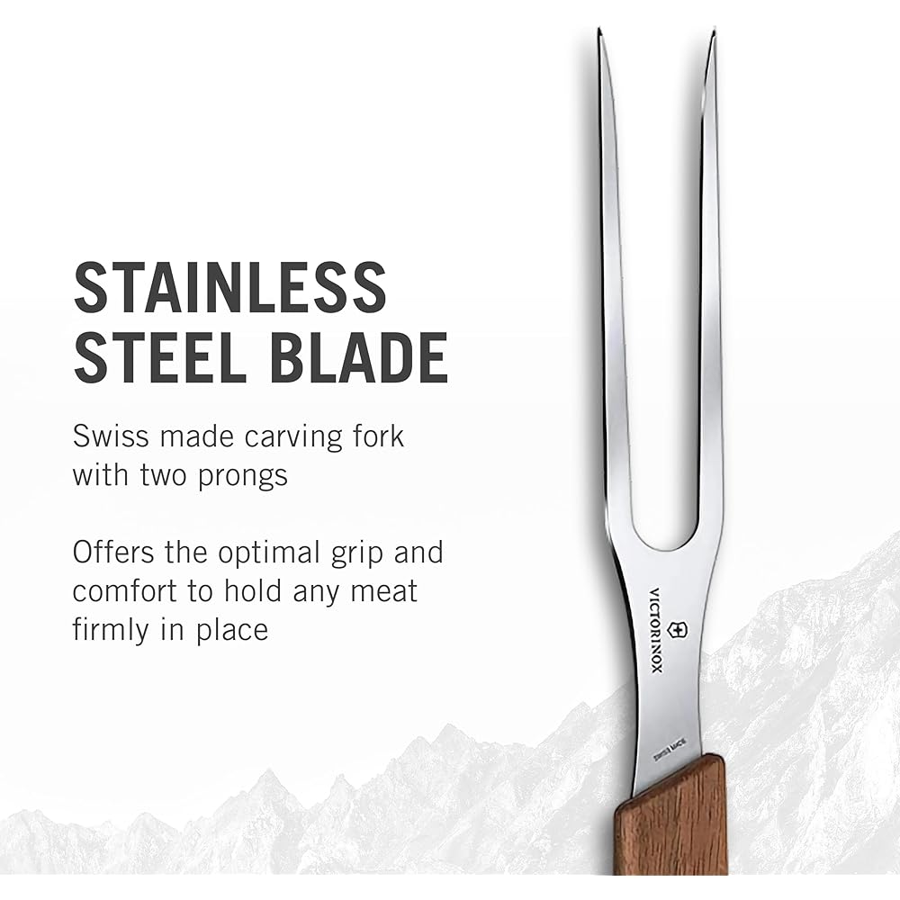This product does not require batteries/batteries This product does not require assembly Size: 26.5 x 2.2 x 1.5 cm Materials: Material [Blade] Stainless steel [Handle] Walnut Country of origin: Switzerland Holds meat securely A bifurcated Swiss carving fork with a durable stainless steel blade and walnut wood handle for maximum stability and grip.
