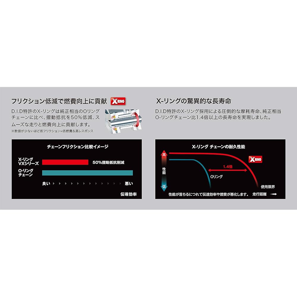 520 size has been upgraded from VX2 to VX3! Improved rigidity further improves operability! - Light and exhilarating riding with light operability Pursuing operability with the DIRECT concept, a new concept unique to DID that emphasizes the rider's sensibilities We have developed a lightweight and highly rigid chain.・Equipped with high performance & best value DID patented X-Ring as standard, achieving low friction and long life. It has achieved both excellent performance and cost performance.・Suitable for a wide range of vehicle models Specially designed for each size greatly improves the basic performance of the chain, making it suitable for a wide range of vehicle models. A higher level of security brings out the fun of riding.・Contributes to improved fuel efficiency by reducing friction DID's patented X-ring reduces sliding resistance compared to the genuine equivalent O-ring chain, contributing to smooth running and improved fuel efficiency.・Extraordinary long life of the X-ring By adopting the DID patented X-ring, we achieved an overwhelming wear life and a longer life than the genuine equivalent O-ring chain.