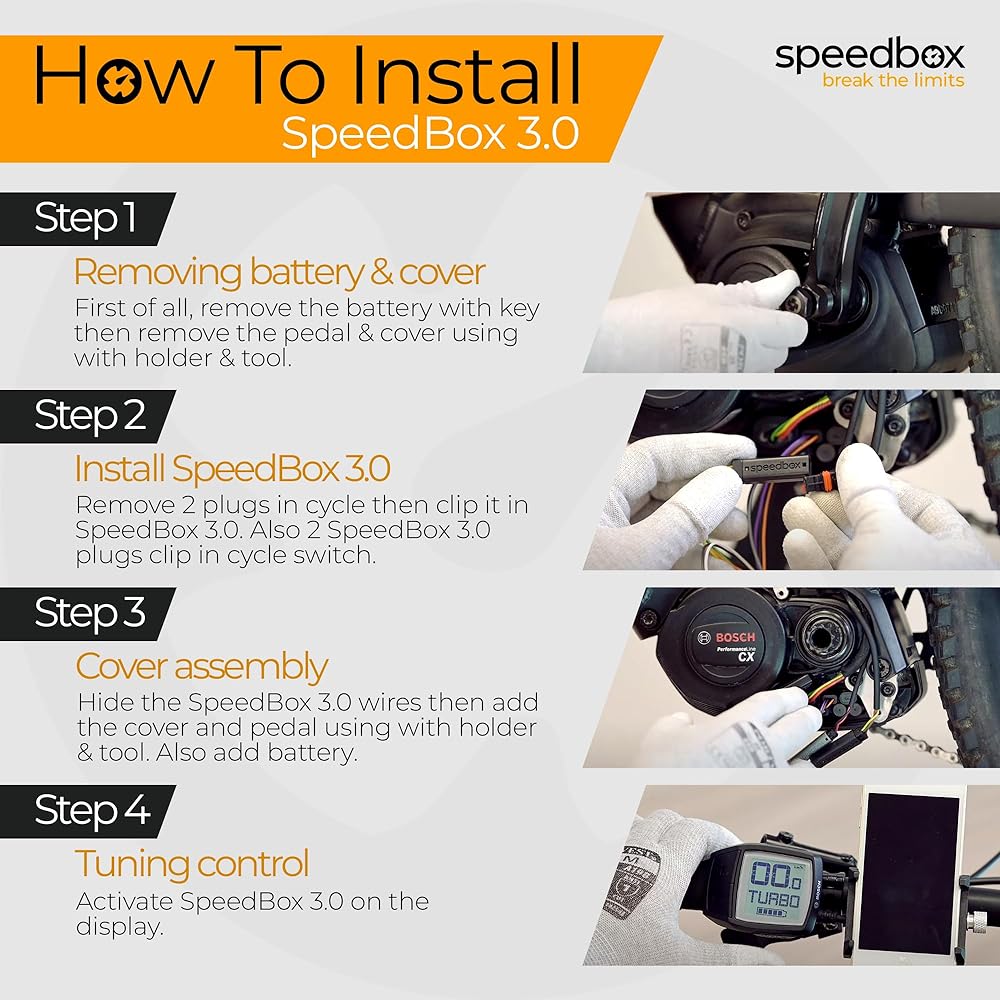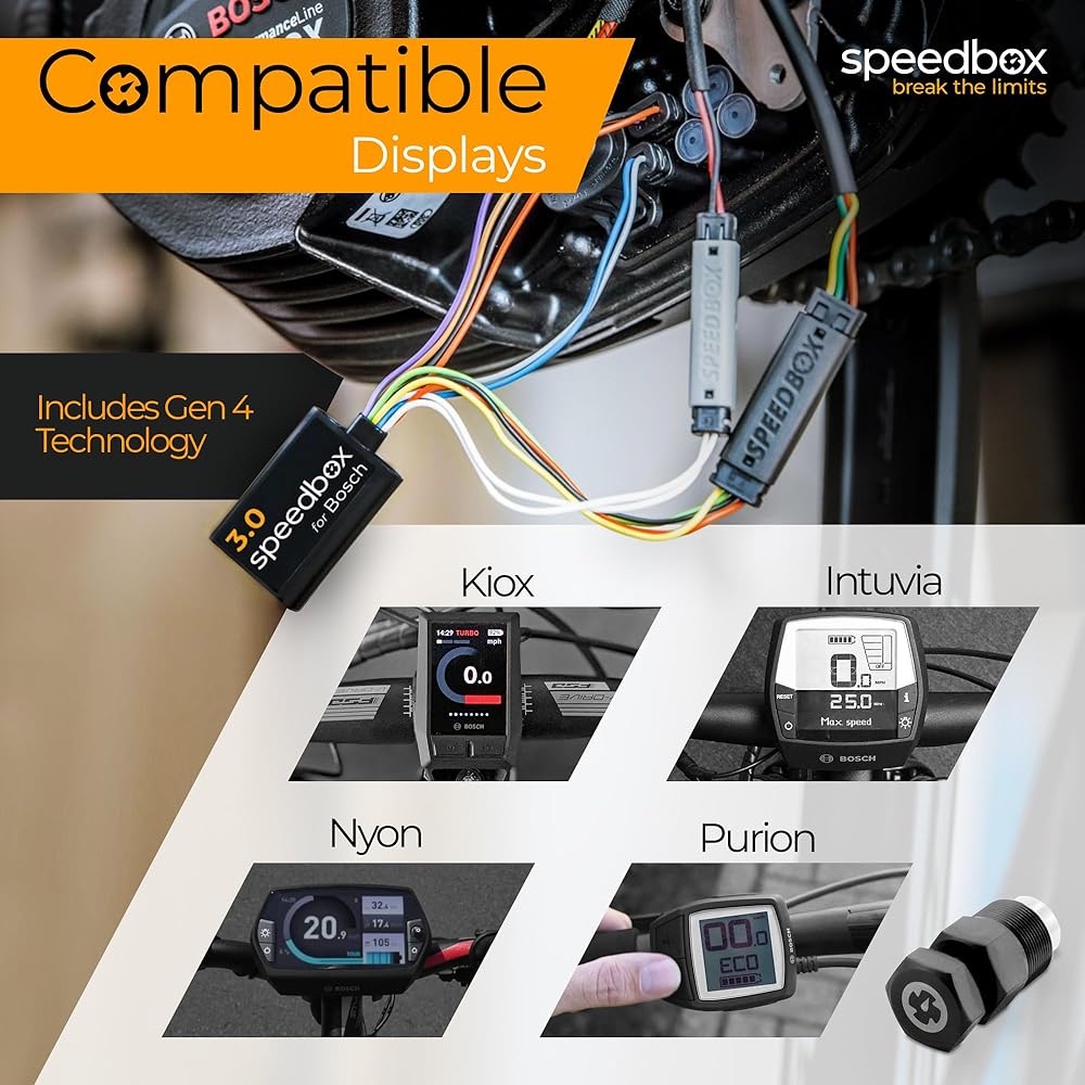 Compatible with Bosch Active Line/Performance Line/Performance CX Line/Active Line Plus (4th generation motor). Display: Not compatible with Intuvia, Purion, Nyon, Kiox, Cobi Bosch Smart System (BES3) and Display Kiox 300. Use SpeedBox 1.0 for smart systems. Full speed limit removed, speeds above 50 km/h. High quality construction with original connectors. Plug-and-play configuration Easy-to-use operation with buttons on the e-bike. Use WALK button or key combo +-+- to enable/disable tuning. When using SpeedBox 3.0 with Bosch 4th generation motors (from 2020), the e-bike must be left on until a constant 0.0 km/h after riding. Legal notice: E-bike tuning chips are not allowed under the Road Traffic Regulations (StVO). Please use at your own risk. We are not responsible for any damages.