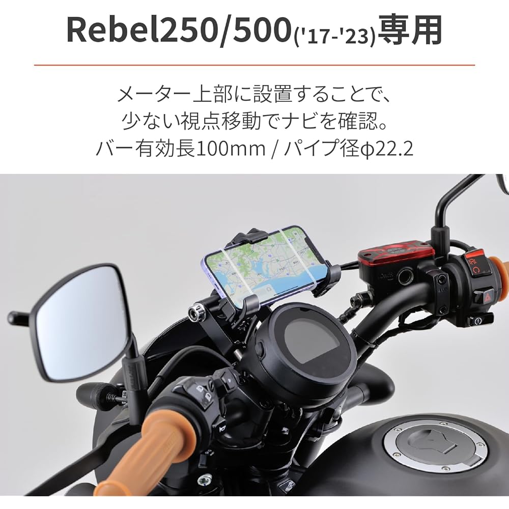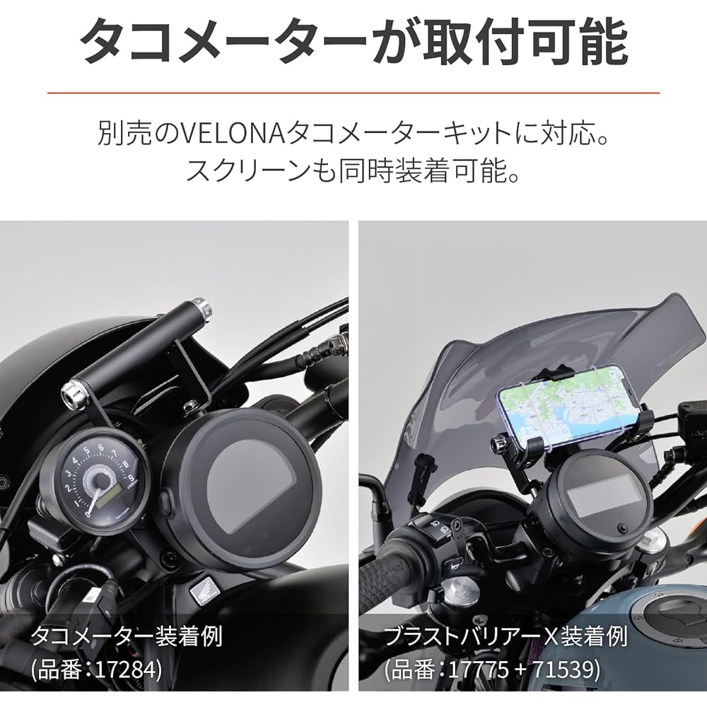 Compatible models: Rebel 250/500 (17-23) Bar effective length 100mm / Pipe diameter φ22.2 PREMIUM ZONE cap bolt color included Customize your favorite color with the cap bolt color (M8) sold separately Daytona Screen KIT, VELONA Tachometer KIT can be installed at the same time.