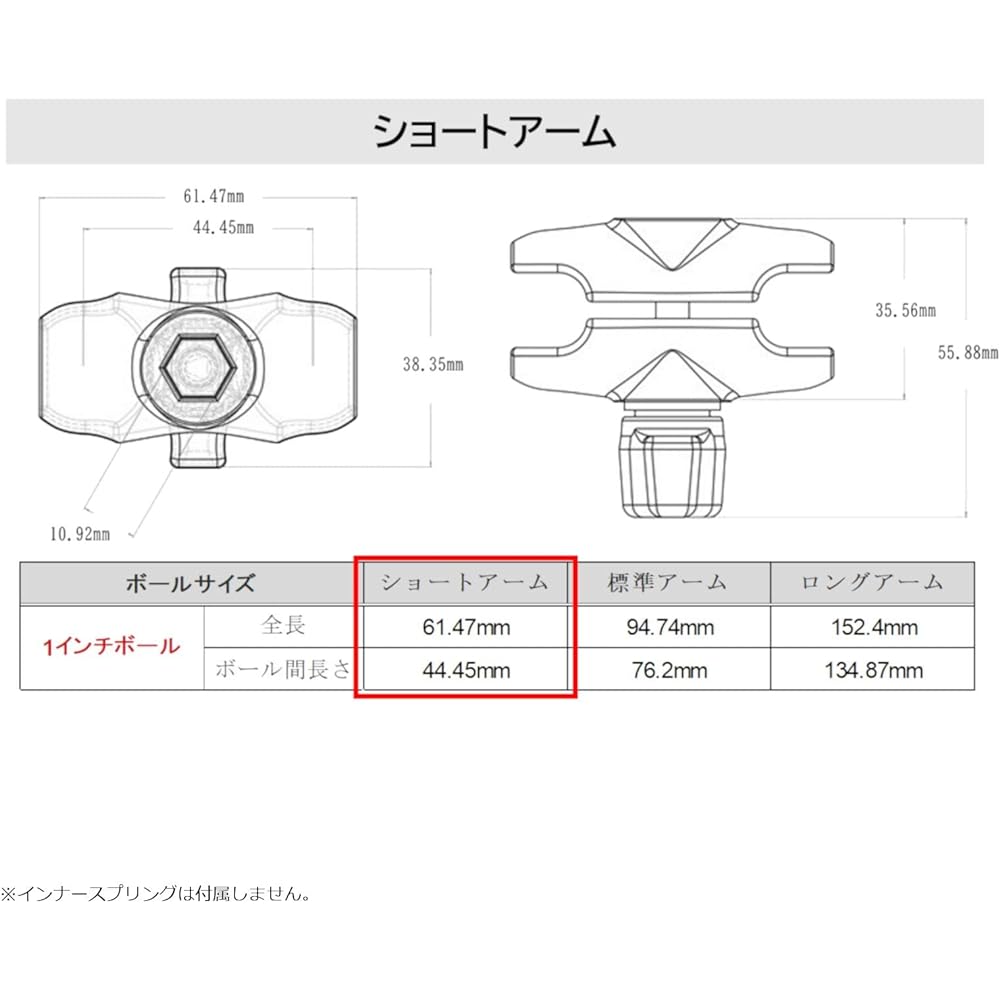 Arm part Short arm Aluminum Approx. 60mm Material: Powder-coated aluminum Arm total length: Approx. 60mm, Length between sockets: Approx. 44mm, Ball size: 1 inch Product contents: 1 set