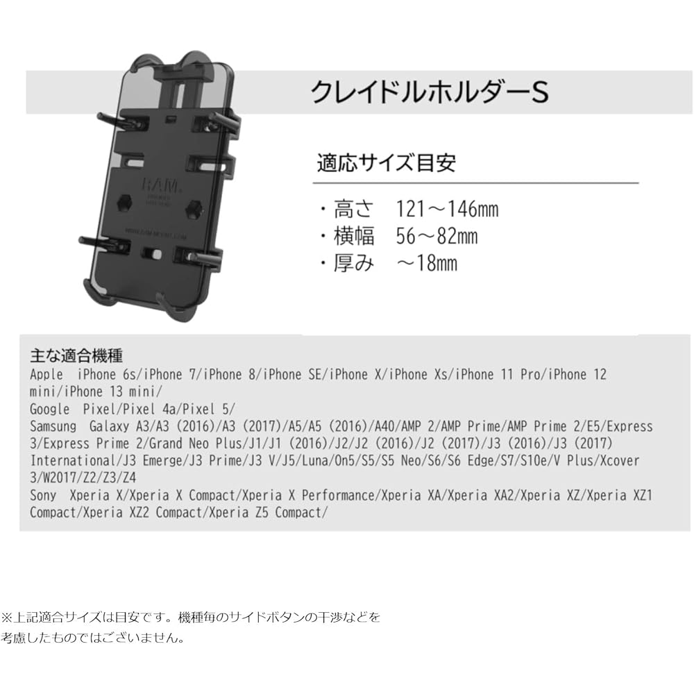 Applicable size: Width 56mm~82mm, height 121mm~146mm, thickness ~18mm Material: High strength plastic Product contents: 1 piece Accessories: Mounting screws, #8-32x1/2inch machine screw, #8-32x5 /8inch machine screw, #8-32x3/4inch machine screw, #8-32 nylock nut Note: Ball part not included (requires a separate rhombus joint to attach to the back) General-purpose smartphone that secures the smartphone by sandwiching it between the top and bottom holder. The main body is made of high-strength composite material, and by attaching a separate diamond-shaped joint to the back, it can be installed in various locations in combination with other ram mount parts.