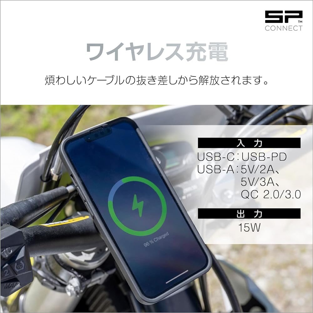 Optional product for SPC + phone case Wireless charging up to 15W Proprietary vibration reduction rubber suppresses vibrations up to 60% IP65 waterproof design Install by replacing the phone case attachment part of each mount
