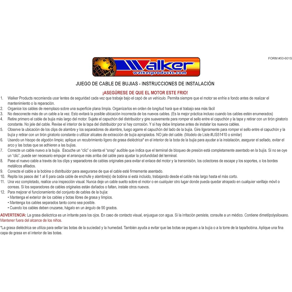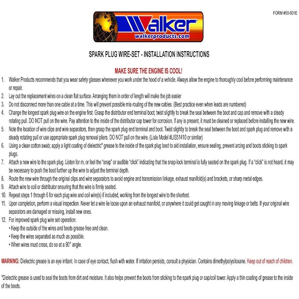 Type: Spark Plug Wire Set Walker Thunder Core-Ultra Spark Plug Wire Set Meets or Exceeds OEM Quality. Walker Thunder Core-Ultra Wiring Sets are manufactured with precision for high quality performance and meet all original equipment specifications. Walker Products Thunder Core-Ultra Wiring Sets are precision manufactured from premium components and are ISO 90012008/TS 16949 certified. It provides exceptional performance and is manufactured to meet all (OEM) specifications and testing requirements. Set includes SAE J2031 rated, Class E silicone, ethylene propylene diene polymer (EPDM) wire construction. The set is temperature resistant in excess of 450-degrees. It features a 350-ohm Kevlar core, impregnated ferrite, stainless steel wire MAG, and a latex silicone layer that both improve the conduction efficiency and stability of the core. ?Hi-temperature boots are made with OE quality terminals, tips, tubing, and dielectric grease. Walker products specialize in the design, manufacture and logistics of automotive engine management components. Walkers are built to meet, and in some cases exceed, (OEM) or comparable standards to our customers' needs. Also see specifications. This EFF